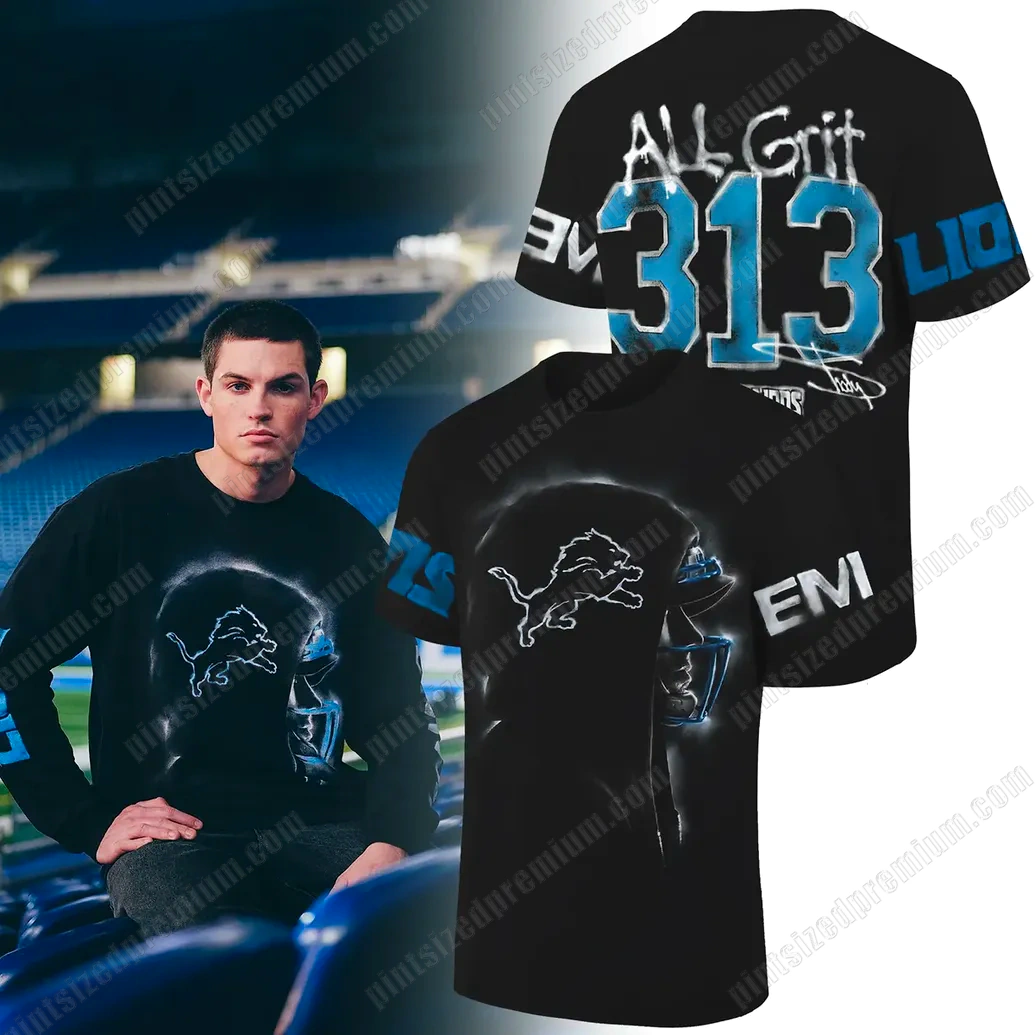Crafted with meticulous attention to detail, this premium T-shirt from PintSizedPremium redefines fan apparel. The deep black fabric provides a striking canvas for its intricate design. On the front, a shadowy figure emerges, cloaked in a hoodie and football helmet, its blue face mask a sharp contrast. Overlaid, the iconic lion logo, rendered in a vibrant electric blue outline, hovers with an ethereal glow, symbolizing Detroit’s beloved team. This artful composition captures the intensity of performance and play. The sleeves tell their own story: “LIONS” in bold blue on the left, and “EM” in crisp white on the right, signifying the seamless cultural blend. The back design bursts with urban energy: “ALL Grit” scrawled in white, graffiti-inspired print across the shoulders, echoing Detroit’s raw determination. Below, the city’s iconic “313” dominates in a distressed, multi-layered blue print, providing an authentic, lived-in feel. “DETROIT LIONS” is confidently presented underneath, grounded by a subtle, artistic signature in white for an exclusive touch. All graphics, from the neon-like glow to the textured “313,” are executed with advanced printing techniques, ensuring a vibrant, long-lasting finish resistant to fading and cracking. This is not just fabric; it’s a wearable masterpiece, an artistic tribute brought to life through superior craftsmanship.