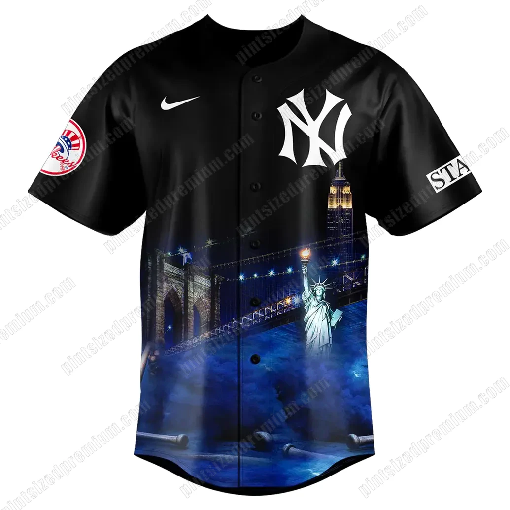 PintSizedPremium’s unwavering commitment to unparalleled craftsmanship and innovative design shines brilliantly in every intricate detail of this exceptional Aaron Judge New York Yankees MVP 2025 Jersey. The front features a profound black base, a dramatic canvas for the iconic white interlocked “NY” emblem. A subtle athletic swoosh emblem adorns the chest, hinting at premium quality. Below the classic logo, the jersey unfolds into a breathtaking panorama: a vivid, high-definition digital print capturing New York’s nocturnal majesty. The legendary Brooklyn Bridge and the majestic Statue of Liberty are illuminated against a dark skyline, engulfed in a unique, atmospheric blue mist effect that creates depth and mystique. Sleeves feature distinct identifiers: a circular team emblem on one, and bold “STAR” lettering on the other. The button-up placket ensures versatile wear. Flipping the jersey reveals an even more opulent and narrative-rich spectacle. The reverse transforms into a grand, illustrative tapestry, celebrating an anticipated or celebrated MVP triumph. Aaron Judge is depicted in a commanding, regal pose, seated upon a meticulously rendered throne crafted from a formidable array of baseball bats, embodying strength and dominance. Above this powerful figure, the magnificent “MVP” insignia takes center stage, adorned with a proud American eagle and intricate, classic ornate gold filigree, set against a luxurious marbled backdrop. Below Judge, a prominent “2025 AMERICAN LEAGUE MOST VALUABLE PLAYER” detail further cements the jersey’s commemorative status. Every element, from the rich, vibrant color saturation of the detailed graphics to the precise, clean lines and superior fabric choice, speaks to a meticulous production process, ensuring a garment that not only captures the eye but also maintains its exceptional aesthetic and feel, setting a new standard for premium fan apparel.
