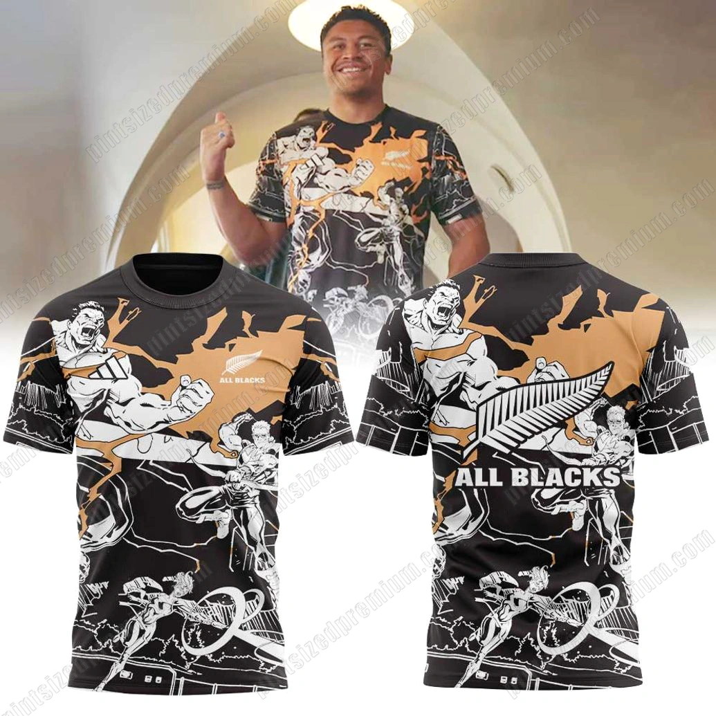 At PintSizedPremium, we believe that premium fan merchandise should be a celebration of craftsmanship, capturing the essence of the legend in every stitch and print. The All Blacks Field of Heroes Captains New T-Shirt stands as a testament to this philosophy. Crafted from a superior, breathable fabric, this t-shirt ensures ultimate comfort whether you are in the thick of the action or enjoying a casual outing. The design itself is a masterpiece of dynamic visual storytelling. A deep, rich black base provides the perfect canvas for vibrant, energetic splashes of a bold gold or amber hue, creating an almost molten effect that suggests raw power and movement. Superimposed upon this striking background are meticulously rendered figures in a distinctive comic-book inspired style, depicted in crisp white outlines. These heroic, muscular figures, reminiscent of legendary captains in action, evoke strength, determination, and the fierce athleticism synonymous with the All Blacks. Prominently featured is the iconic silver fern logo, precisely integrated into the dynamic artwork, alongside bold “ALL BLACKS” lettering. The intricate details of each figure, from their powerful stances to their implied motion, are brought to life through advanced, full-sublimation printing techniques. This ensures the vivid colors and sharp outlines are not only incredibly durable and resistant to fading, but also create a seamless, all-encompassing artistic statement that flows effortlessly across the entire garment – front, back, and sleeves – making every angle a tribute to the team’s enduring spirit and the art of heroic endeavor.