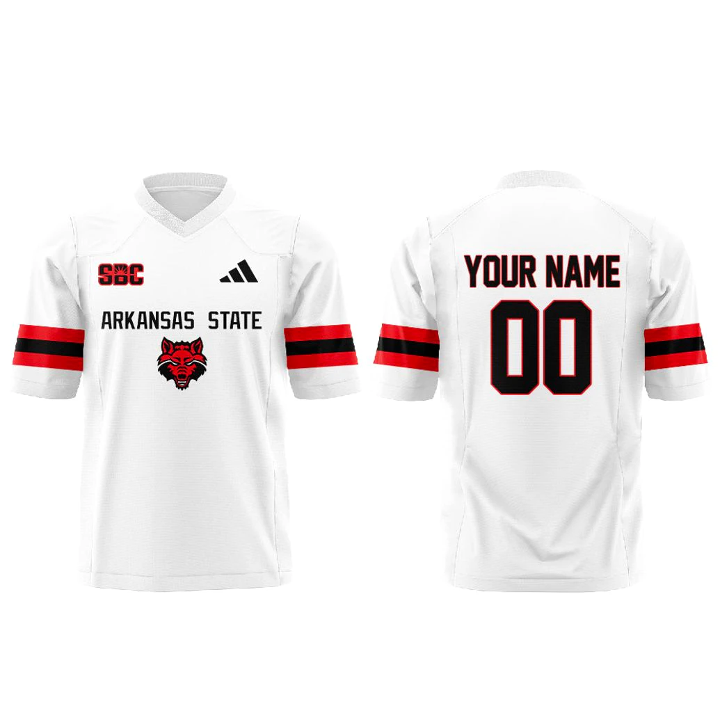 PintSizedPremium’s commitment to premium quality and meticulous craftsmanship shines through every detail of this Arkansas State Football New Uniform Launch 2025 Jersey. The jersey’s pristine white base provides a crisp canvas, exuding a clean, professional aesthetic that mirrors the team’s bold new vision. Striking red and black stripes dynamically adorn the sleeves, a vibrant visual representation of the Red Wolves’ fierce intensity and storied colors. Prominently displayed on the chest is the conference insignia, a mark of collegiate excellence, alongside a distinguished athletic brand mark that signifies top-tier performance apparel. Below these, the bold “ARKANSAS STATE” lettering leaves no doubt about your loyalty, perfectly complemented by the iconic, aggressively stylized Red Wolves mascot – a symbol of power, cunning, and unwavering determination. The robust construction ensures durability, while the superior fabric blend offers exceptional comfort and breathability, engineered to keep you cool and collected whether you’re under stadium lights or enjoying a casual outing. On the reverse, the customizable “YOUR NAME” and “00” in contrasting black with a subtle red highlight offer a personal touch, allowing you to truly make this piece your own, celebrating individual fandom within the collective roar. This isn’t merely a replica; it’s a meticulously engineered garment, designed to honor the legacy of Arkansas State with unparalleled precision and style.
