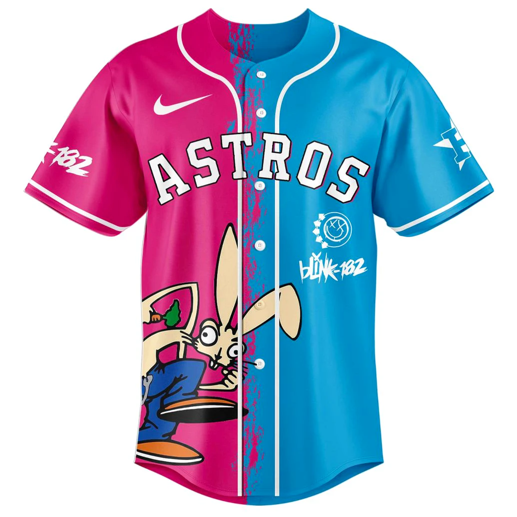 Every stitch and hue of this exclusive PintSizedPremium creation speaks volumes about its exceptional craftsmanship and innovative design, drawing directly from the most iconic visual elements of its inspirations. The jersey’s split-panel construction, featuring vibrant hot pink on one side and a striking aqua blue on the other, creates an immediate visual impact, reflecting the dynamic contrast inherent in its dual-fandom appeal. Across the chest, the bold, classic lettering of “Astros” stands proudly, signifying unwavering team allegiance. Complementing this, a leading sportswear emblem is subtly integrated, a mark of athletic quality and contemporary style. Below, a uniquely stylized bunny character, full of punk rock energy, leaps across the fabric, embodying the playful yet rebellious spirit of a beloved band. This mischievous rabbit is paired with a distinct smiley face logo featuring X-ed out eyes and the iconic cursive script of the band’s name, cementing its musical heritage. The full button-down front adds a timeless baseball aesthetic, while the clean white piping serves to emphasize the dramatic color split. Turning to the back, the jersey transforms into a canvas of rock history. A powerful graphic prominently features the band members, their expressions capturing the raw emotion and enduring legacy of their music. Above them, “Missionary Impossible” and “Blink-182 2025 Tour” are boldly displayed, flanked by “Alkaline Trio” as a nod to fellow touring artists. A detailed list of tour dates further immerses you in the event’s story, while poignant lyrics “WHERE ARE YOU? AND I’M SO SORRY” evoke a deep connection to the band’s heartfelt anthems. A classic baseball league emblem adorns the collar, unifying the design, and a stylized “H” symbol on the sleeves discreetly references the team’s roots. This fusion of meticulous print work and thoughtful design ensures that every angle tells a story of passion, precision, and unparalleled fan pride.