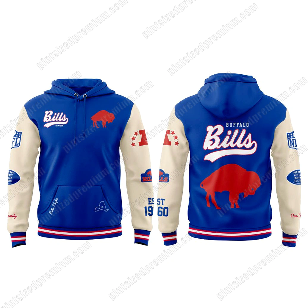 At PintSizedPremium, we believe that true fanwear should be a masterpiece of both spirit and substance, a commitment evident in every stitch and detail of this extraordinary hoodie. The Buffalo Bills By Golf New Edition Hoodie is a testament to superior craftsmanship, blending classic varsity aesthetics with modern comfort. Its striking color palette features a vibrant royal blue body, symbolizing the team’s iconic colors, perfectly complemented by the contrasting cream-colored sleeves that evoke a timeless, athletic charm. The front proudly displays the iconic “Bills” script in a distinctive style, accompanied by a bold red buffalo emblem, an unmistakable symbol of strength and heritage. Further enhancing its unique appeal, the lower left side showcases a stylized outline of New York state, subtly identifying the heart of this passionate fanbase, underscored by the proud declaration of “Bills Mafia.” The sleeves are adorned with intricate patches and designs, including the recognizable league emblem and a star-studded “A” graphic, adding layers of authenticity and narrative. Turning to the back, the hoodie makes an even grander statement with a commanding “BUFFALO Bills” script across the shoulders and a large, prominent red buffalo, ensuring your allegiance is visible from every angle. Below this, “EST 1960” marks the team’s storied beginning, while “One Family” encapsulates the collective spirit. The cuffs and hem are finished with sporty red and blue stripes, providing a polished touch that completes this exceptional design. Every element, from the precision of the printed graphics to the implied luxurious feel of the fabric, has been chosen to deliver unparalleled quality and durability, ensuring this hoodie stands the test of time and countless celebrations.