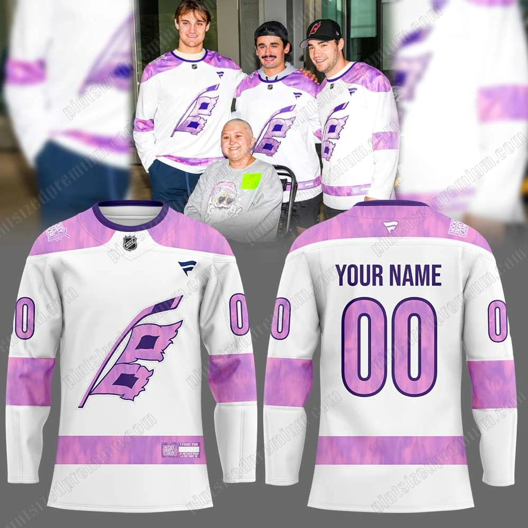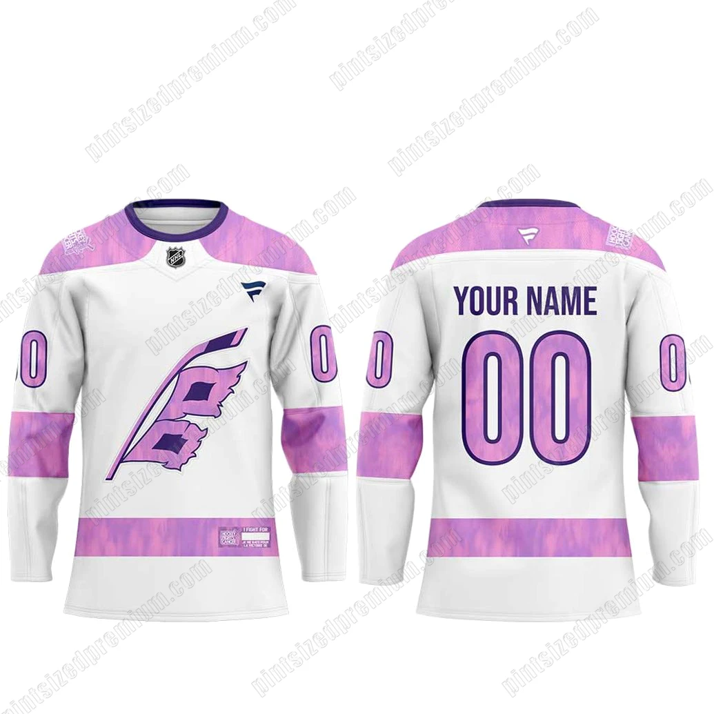 At PintSizedPremium, we believe that premium fan merchandise should be a testament to exceptional craftsmanship and thoughtful design, capturing the essence of both team spirit and noble causes. The Carolina Hurricanes 2025 Fight Cancer Limited Hockey Jersey embodies this philosophy in every stitch and detail. Crafted on a pristine white base, the jersey immediately catches the eye with its striking purple accents, adorning the shoulders, cuffs, and lower waistline. These vibrant purple sections feature a subtly distressed, almost watercolor-like pattern, giving the garment a unique depth and character that elevates it beyond standard team wear. The front proudly displays a prominent, stylized C-shaped flag logo, complete with elegant wing details, all rendered in the same impactful purple hue, making it instantly recognizable and deeply meaningful. Above this central emblem, a meticulously embroidered league crest signifies authenticity and quality, while a sleek, distinct brand logo on the right chest further reinforces its premium standing. On the back, customization takes center stage, offering space for “YOUR NAME” above a bold “00” number, allowing fans to personalize their connection to the team and the cause. Each number “0” on the sleeves reinforces this personalization, seamlessly integrating into the overall design. A special “FIGHT FOR” patch, visible on the lower front, serves as a poignant reminder of the jersey’s mission, meticulously woven to reflect its dedication. This careful attention to detail, from the vibrant color palette to the precision of the graphics and the quality of the fabric, ensures not only a visually stunning piece but also one designed for comfort and durability. It’s an artistic interpretation of fan dedication, built to last and to be cherished.