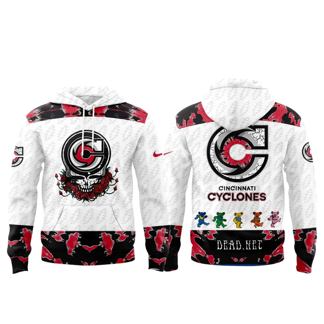 PintSizedPremium takes immense pride in crafting apparel that stands out not only for its unique design but also for its unparalleled quality and attention to detail. This Cincinnati Cyclones Grateful Dead Night 2026 Special Hoodie is a prime example of our commitment to excellence, meticulously designed to honor both the athletic prowess of the Cyclones and the rich tapestry of its cultural inspiration. The hoodie features a pristine white base, serving as a dynamic canvas for the striking red and black abstract patterns that flow across the shoulders, sleeves, and lower body, evoking a sense of motion and fierce energy. The front prominently displays the iconic Cincinnati Cyclones ‘C’ emblem, thoughtfully integrated with a powerful skull and intricately detailed roses motif, a legendary symbol that speaks volumes to those in the know. Every rose petal, every contour of the skull, is rendered with precision, creating a visually stunning fusion. On the back, the design continues to captivate with a distressed Cyclones ‘C’ emblem, adding a vintage edge, framed by bold “CINCINNATI CYCLONES” text. Below, a vibrant line of five colorful dancing bears infuses a playful, joyous spirit into the garment, celebrating the lighter, more whimsical side of its inspiration. These elements are not merely printed but are integrated with advanced techniques to ensure exceptional color vibrancy, crisp detail, and lasting durability, resisting fading and wear through countless washes and adventures. This commitment to superior craftsmanship ensures that the hoodie not only looks incredible but feels comfortable and robust enough for any occasion.