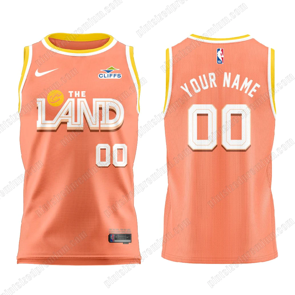 At PintSizedPremium, craftsmanship is not just a promise; it’s the very foundation of our premium crossover fan merchandise. The Cleveland Cavaliers 2025-26 City Edition New Uniform Custom Jersey exemplifies this dedication, meticulously designed to honor both aesthetic appeal and tactile quality. Observe the striking, vibrant peachy-orange hue that forms the jersey’s primary canvas, a bold and modern interpretation that truly pops, exuding a fresh, energetic aura. This unique color palette is masterfully complemented by sharp yellow trim accentuating the neckline and armholes, creating a dynamic contrast that catches the eye and reinforces the jersey’s premium feel. Front and center, the iconic “THE LAND” graphic stands proud in crisp white, its bold, stylized lettering underscored by a golden yellow circle cradling a distinctive ‘C’, reminiscent of a rising sun or a perfectly arcing basketball – a clever nod to both the city’s identity and the game itself. Beneath this powerful statement, a clean, white “00” awaits your personalization, signaling the custom nature of this elite garment. The subtle sponsor emblem and a sleek, athletic mark near the collar add authentic detailing, while the reverse side proudly showcases “YOUR NAME” above your chosen “00”, rendered in the same striking white, inviting you to literally put yourself in the game. Crafted from a premium, breathable fabric, this jersey ensures comfort and durability, whether you’re intensely cheering from the stands or enjoying a casual day out.