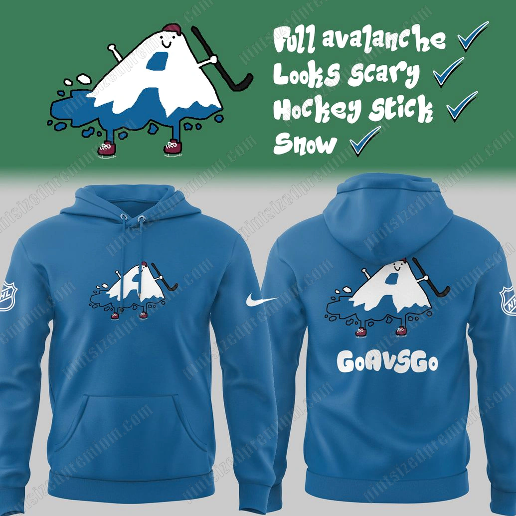 At PintSizedPremium, we believe that fan apparel should be as meticulously crafted as the plays on the ice, fusing distinctive design with unparalleled quality. The Colorado Avalanche 2025 Full Avalanche Looks Scary Stick Snow Hoodie is a masterclass in this philosophy, starting with its vibrant, signature cerulean blue hue, reminiscent of a crisp Colorado sky on a perfect game day. This rich, enduring color serves as the perfect canvas for the hoodie’s captivating centerpiece: a charming yet formidable cartoon mountain peak, expertly rendered to form the iconic ‘A’ of the Avalanche. This isn’t just any mountain; it’s an animated character, complete with a playful red cap perched atop its snowy crest and a trusty hockey stick held ready for action. Its base is artfully depicted with dynamic swirls of snow and ice, further emphasized by tiny, spirited ice skates, giving the impression of a mountain ready to glide onto the rink itself. The graphic’s print style is engineered for longevity, featuring crisp lines and brilliant color saturation that resists fading, ensuring your fan pride remains vivid season after season. Every detail, from the robust stitching of the kangaroo pocket to the snug, ribbed cuffs and hem, speaks to PintSizedPremium’s dedication to durability and comfort. The plush, premium-grade fabric ensures a soft touch against the skin and provides substantial warmth, making it ideal for brisk evenings at the arena or cozy nights at home. An authentic league mark subtly placed on the sleeve confirms its official association, while the back proudly displays the rallying cry, “GoAvsGo,” rendered in a bold, complementary typeface, cementing your allegiance from every angle.