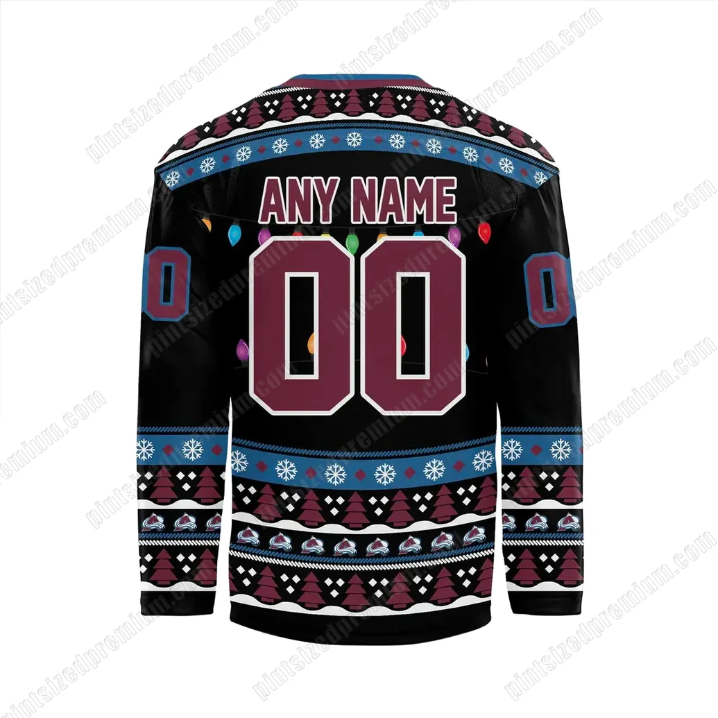 At PintSizedPremium, we believe true fan merchandise should be a testament to exceptional craftsmanship and thoughtful design. Our Colorado Avalanche 2025 Merry Christmas Hockey Jersey stands as a prime example, meticulously crafted to capture the essence of both team spirit and festive delight. The jersey features a sophisticated black base, serving as the perfect backdrop for the vibrant holiday-themed graphics. Dominating the chest is the iconic Avalanche logo, reimagined with a playful red Santa hat perched atop, instantly signaling holiday cheer. This central emblem is beautifully framed by strings of brightly colored Christmas lights, interwoven with the classic team colors of maroon and blue, adding a lively touch. The sleeves and lower hem are adorned with intricate “ugly Christmas sweater” patterns, seamlessly blending snowflakes, evergreen trees, and subtle winter sport motifs in striking maroon, white, and teal hues. These detailed designs are executed with a high-definition print style, ensuring every snowflake and tree stands out with crisp clarity. The neck features a classic hockey jersey collar, reinforced for comfort and durability, while the distinctive league shield detail adds an authentic touch to this premium fan apparel. The back of the jersey offers unparalleled personalization, proudly displaying a customizable name and number in bold maroon with a crisp white outline, allowing you to truly make this piece your own. Every stitch, every color choice, and every festive detail reflects PintSizedPremium’s commitment to producing fan merchandise that is not only visually stunning but also built to last, providing enduring comfort and style season after season.
