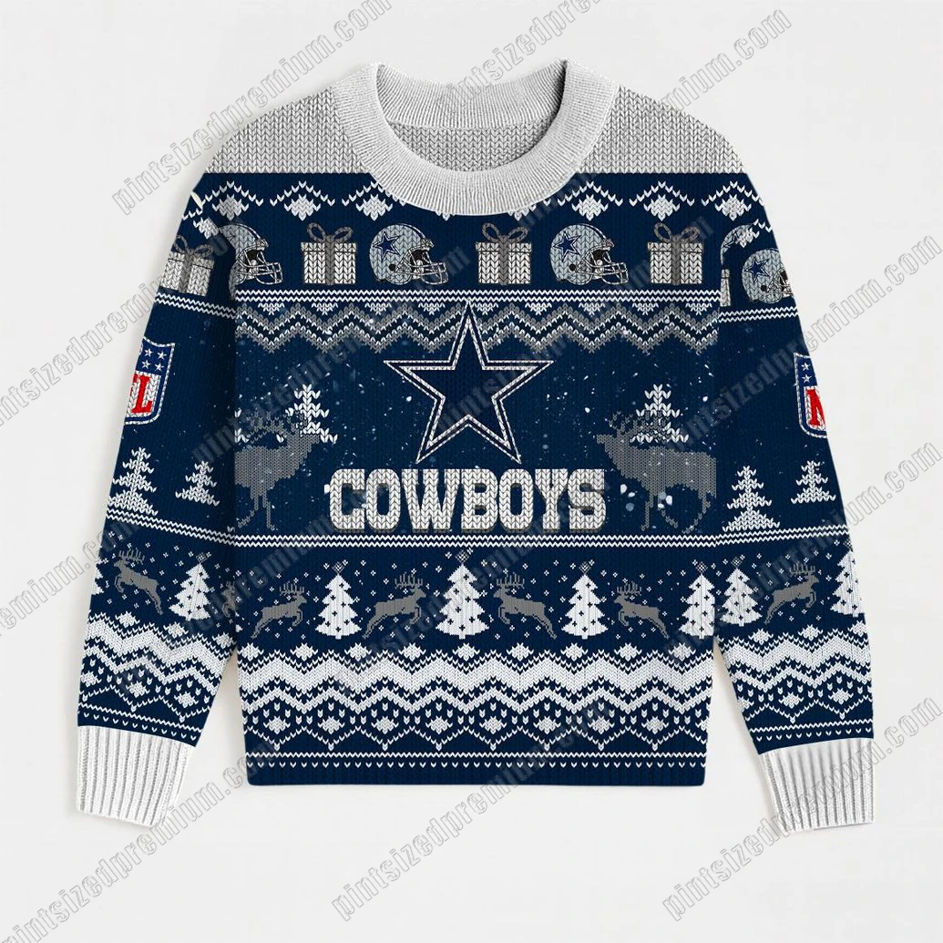At PintSizedPremium, craftsmanship is paramount, and this premium ensemble is a testament to our dedication to superior quality and intricate design. The rich, deep navy blue fabric serves as the perfect canvas, reminiscent of the Cowboys’ iconic colors, while crisp white and grey accents add a sophisticated holiday touch. The sweater and shorts feature a meticulously designed festive knit pattern, artfully blending traditional holiday motifs with unmistakable team iconography. You’ll find intricately rendered snow-laden pine trees, stylized reindeer, and classic geometric patterns creating a cozy, celebratory atmosphere. Interspersed throughout this festive landscape are prominent Dallas Cowboys star logos, boldly proclaiming your allegiance. Below the central star on the sweater, the “COWBOYS” lettering is proudly displayed. The official NFL shield is also subtly yet distinctly integrated into the design on both sleeves of the sweater and on the shorts, guaranteeing authenticity. Adding a unique touch, miniature football helmets are cleverly incorporated into wrapped gift box designs, fusing your two passions into one cohesive, eye-catching aesthetic. The sweater boasts a comfortable ribbed crew neck, cuffs, and hem, while the shorts feature a complementary ribbed waistband, all in a contrasting white, ensuring both style and an exceptional fit. Every detail, from the color palette to the pattern integration, is thoughtfully executed to deliver a truly premium product.
