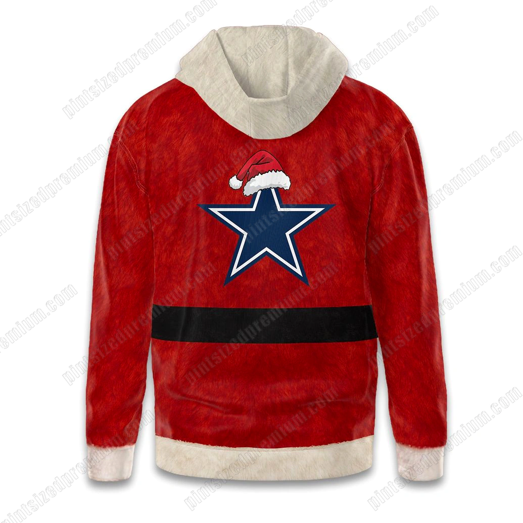 At PintSizedPremium, we believe true fan merchandise should be a testament to both passion and peerless quality. The Dallas Cowboys Noel Costume Christmas 2025 Hoodie exemplifies this philosophy, crafted with meticulous attention to detail that brings your festive fan fantasy to life. This striking hoodie is rendered in a luxurious, deep red hue, expertly printed to mimic the plush texture of Santa Claus’s iconic suit. Crisp, bright white faux fur detailing is seamlessly integrated into the design, framing the hood with a cozy embrace, running elegantly down the central placket, and accentuating the cuffs and hem to create an authentic costume aesthetic. A bold black belt graphic, complete with a gleaming gold buckle, cinches the midsection, adding a touch of classic holiday charm. Turn around, and the true heart of your fandom is revealed: the legendary Dallas Cowboys star logo, rendered in its classic navy blue with a sharp white outline, takes center stage. Playfully perched atop the star is a charming miniature Santa hat, a unique graphic flourish that marries team spirit with holiday whimsy. The interior of the hood features a subtle, cream-colored lining, providing an extra layer of comfort and warmth, ensuring this piece feels as good as it looks. Every element is brought to life through advanced printing techniques, ensuring vivid colors, sharp details, and lasting durability that will withstand countless celebrations.