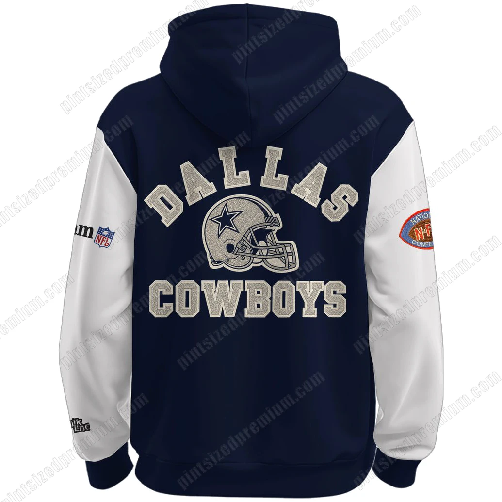 Crafted with the discerning fan in mind, the Dallas Cowboys x Malone Halftime Kickoff 2025 Hoodie exemplifies PintSizedPremium’s unwavering commitment to superior quality and distinctive design. The garment’s foundation is a rich, deep navy blue body, perfectly complemented by crisp white sleeves, creating a classic, athletic aesthetic that is instantly recognizable and always in vogue. Adorning the front, a meticulously rendered grey Dallas Cowboys helmet logo, complete with the iconic star, sits proudly beneath “COWBOYS” text, a bold declaration of allegiance. Adjacent to this timeless emblem, a distinctive white outline signature adds an element of personal connection to the cultural event it celebrates, symbolizing the unique collaboration at the heart of this collection. The rear of the hoodie makes an equally powerful statement, featuring the prominent “DALLAS” text arching gracefully over the same detailed helmet logo, with “COWBOYS” boldly placed below, ensuring your team pride is visible from every angle. Each sleeve tells a story of its own: one proudly displays a “NATIONAL FOOTBALL CONFERENCE” patch alongside the Red Kettle Kickoff motif, signifying the event’s noble cause, while the other features a “Team NFL” logo, anchoring the piece firmly in the world of professional football. Every graphic, from the intricate logos to the textual declarations, boasts a premium finish, utilizing high-quality print and appliqué techniques that ensure lasting vibrancy and texture, reflecting PintSizedPremium’s dedication to craftsmanship that endures. The soft, heavyweight fabric, durable drawstrings, and practical kangaroo pocket are all hallmarks of a garment designed for comfort, longevity, and everyday utility, ensuring this hoodie is not only a collector’s dream but also a go-to piece in your premium wardrobe.