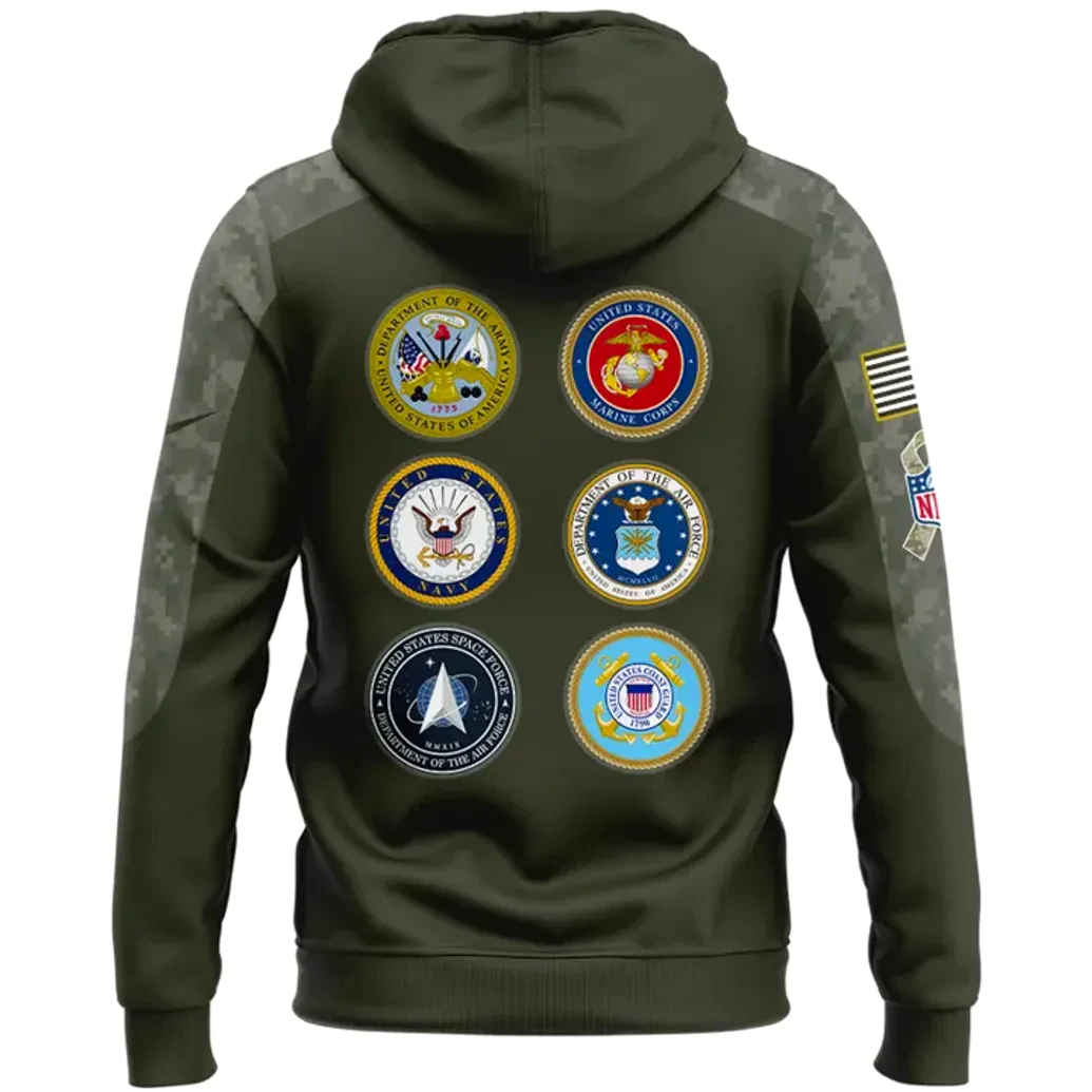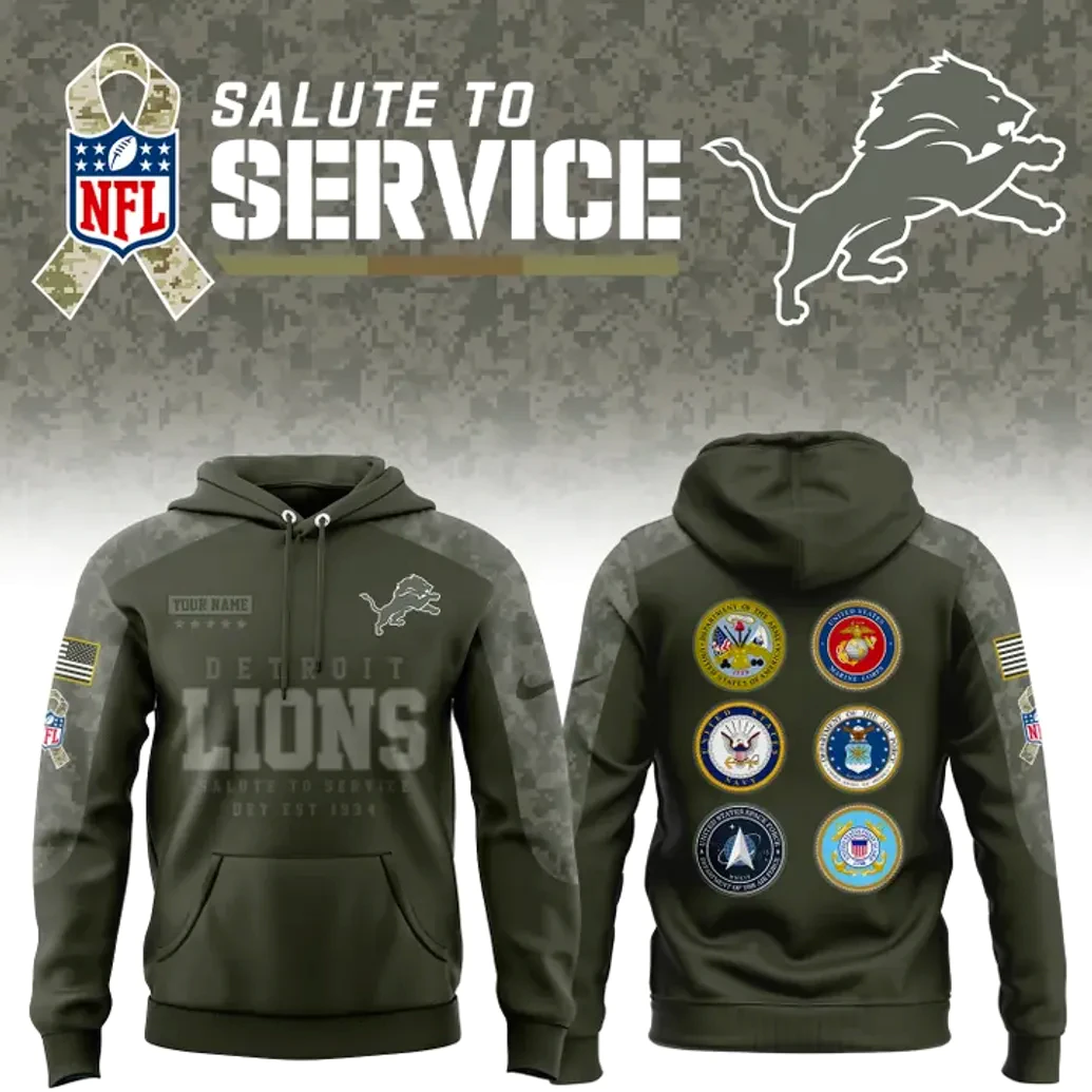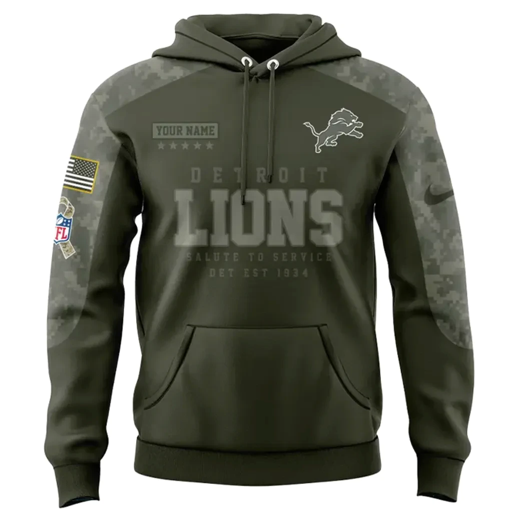 Crafted with an uncompromising dedication to detail, the Detroit Lions Veterans Day 2025 Hoodie stands as a testament to PintSizedPremium’s commitment to superior quality and distinctive design. The rich, deep olive green hue forms the foundation of this commemorative piece, a color instantly evoking a sense of solemn respect and military heritage. This robust base is elegantly contrasted by a subtle yet striking digital camouflage pattern that adorns the shoulders and sleeves, seamlessly blending fan aesthetics with a tribute to service. Across the chest, the iconic “DETROIT LIONS” lettering is emblazoned with a bold presence, its slightly textured finish adding depth and character, ensuring your team loyalty is unmistakably clear. Below this, the phrase “SALUTE TO SERVICE” acts as a powerful reminder of the hoodie’s core message, complemented by “DET EST 1934,” anchoring the team’s rich history. The leaping Detroit Lions logo, rendered in a crisp, light grey, perches proudly on the right chest, while the left sleeve thoughtfully showcases an American flag patch alongside the distinct NFL emblem and the revered “Salute to Service” ribbon logo, intricately woven into the camouflage pattern. The generous front pouch pocket offers both practicality and a classic hoodie silhouette, while the adjustable drawstrings complete the comfortable and stylish design. Turning to the back reveals the true heart of this tribute: six meticulously detailed circular seals representing each branch of the United States Armed Forces—the Army, Marine Corps, Navy, Air Force, Space Force, and Coast Guard. Each seal is rendered with exceptional clarity and vibrant color, forming a powerful mosaic of honor and valor, ensuring that every angle of this hoodie communicates a profound message. The option for personalized embroidery, indicated by the “YOUR NAME” placeholder above a five-star insignia, elevates this garment from mere merchandise to a cherished, bespoke item.