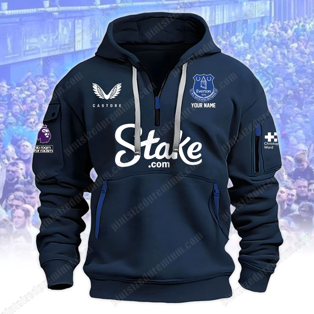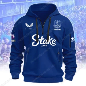 Crafted with the discerning fan in mind, the Everton FC New Edition Zip Hoodie from PintSizedPremium is a masterclass in design and durability. Its striking royal blue hue instantly commands attention, a direct nod to Everton’s iconic colors, vividly displaying your loyalty. The premium fabric offers a superior blend of comfort and resilience, perfect for enduring unpredictable elements or providing cozy warmth. A sleek half-zip closure at the front provides versatile styling, allowing adjustment for comfort and look, while the thoughtful hood offers extra protection and urban flair. Every detail speaks to meticulous attention, from the crisply rendered Everton FC crest proudly positioned on the right chest, symbolizing decades of history and triumph, to the dynamic Castore wings logo on the left, representing modern athleticism. The prominent Stake.com branding across the chest is rendered with precision, integrating seamlessly into the overall aesthetic. Functionality meets fashion with innovative sleeve pockets; the left sleeve features a practical flap pocket adorned with the significant No Room For Racism patch, a powerful statement of inclusivity. On the right, a zippered pocket carries a subtle yet impactful Christoph Ward cross symbol, adding another unique layer of detailing. The integrated kangaroo-style front pocket is reimagined with vertical zippered entries, ensuring essentials are secure while maintaining a streamlined silhouette. Ribbed cuffs and hem provide a snug fit, enhancing warmth and ensuring the hoodie retains its shape through countless wears. This hoodie is engineered for the dedicated supporter, offering both aesthetic appeal and practical utility, ready to be personalized with YOUR NAME for that ultimate touch of individuality beneath the historic club crest.