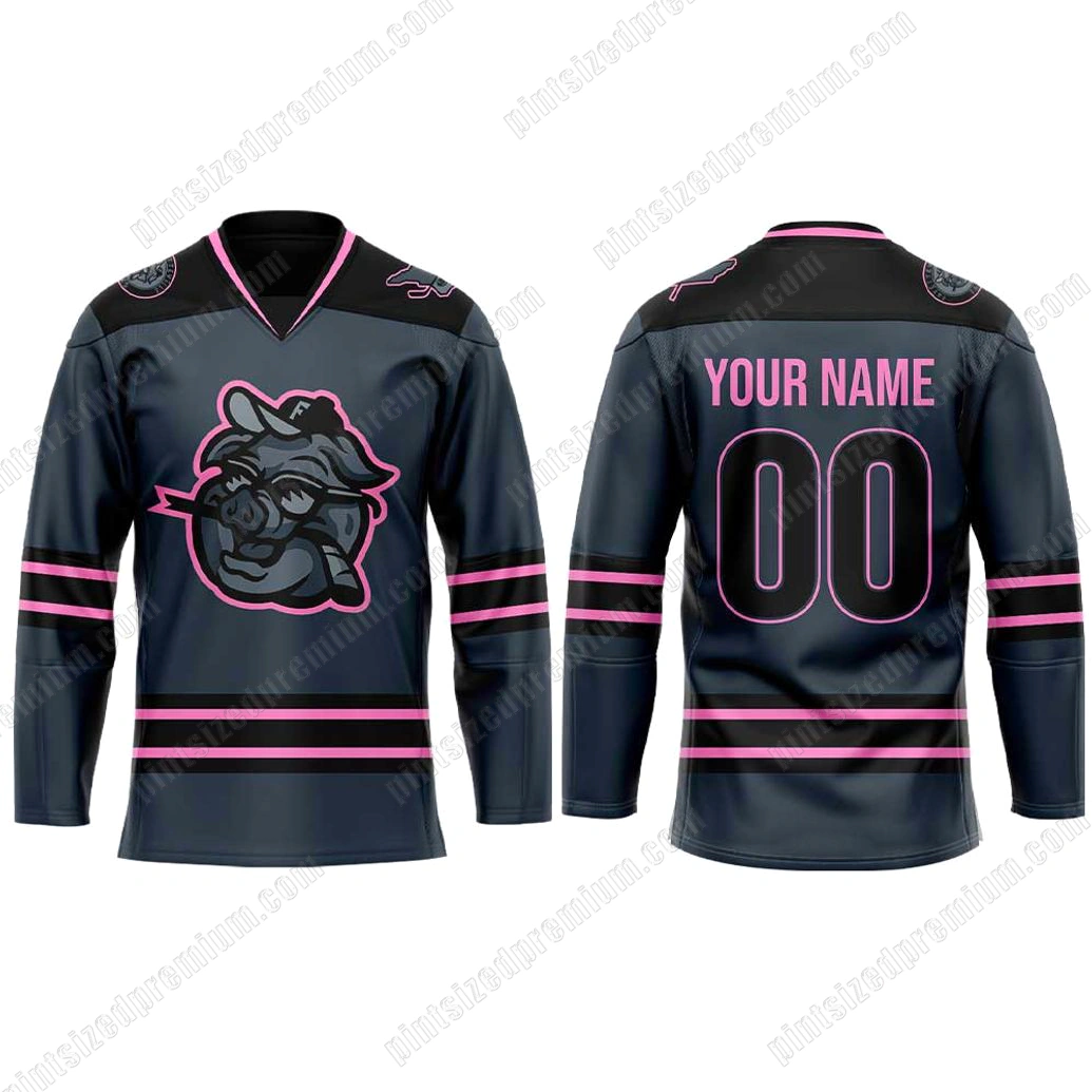 At PintSizedPremium, the creation of the Fayetteville Marksmen Fatbacks Mode Uniform Combo Hockey Jersey is a meticulous process, where every detail is a stroke of artistic precision and a testament to superior craftsmanship. The jersey’s striking aesthetic begins with a sophisticated dark grey base, a canvas that perfectly highlights the bold, electric pink accents defining its unique character. Front and center, the distinctive Fatbacks mascot proudly asserts its presence – a cool, stylized pig, exuding confidence with its signature sunglasses and cigar, rendered in a powerful grey silhouette with a vibrant pink outline that commands attention. This emblem is not just a logo; it’s a character, a statement, and a symbol instantly recognizable to true enthusiasts. Above this, the “BLACKOUT WEDNESDAY” text in matching electric pink reinforces the special event and exclusive theme of this particular uniform. The sleeves feature sleek, horizontal pink banding on the forearms, providing a dynamic visual contrast and reinforcing the jersey’s sporty appeal. Crafted from high-quality, durable fabric, the jersey offers both comfort and longevity, ensuring it withstands the test of passionate cheering and countless adventures. The back of the jersey offers a personalized touch, featuring “YOUR NAME” above large, prominent “00” numbers, both in the signature electric pink, inviting you to make this piece truly your own and wear your identity with pride. Subtle circular emblems on the shoulders and upper back add to the premium detailing, reflecting PintSizedPremium’s unwavering commitment to authentic design and unparalleled quality.