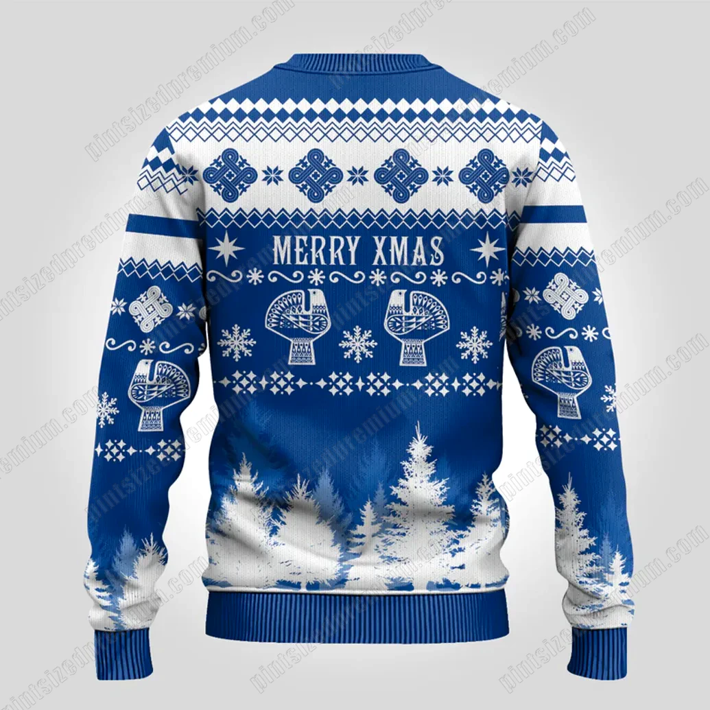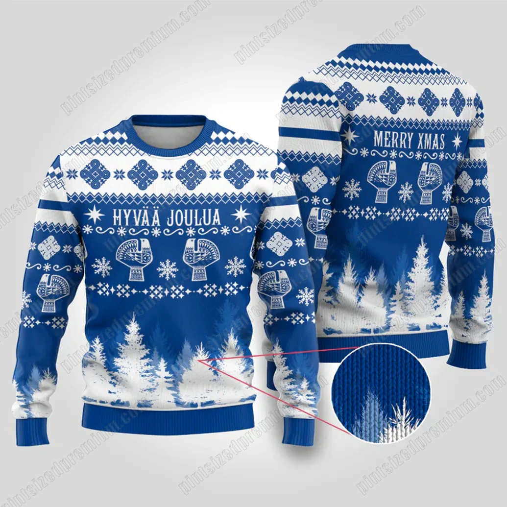 At PintSizedPremium, we pride ourselves on crafting pieces that tell a story, and the meticulous design of this festive garment is no exception. The sweater features a striking palette of deep, regal blue and crisp, pure white, reminiscent of Finland’s national flag and its pristine snowy landscapes. Across the shoulders, cuffs, and hem, classic Nordic-inspired patterns create a timeless, intricate border, evoking the traditional artistry passed down through generations. The front of the sweater proudly displays the heartwarming Finnish greeting “HYVÄÄ JOULUA” flanked by delicate snowflakes, setting the perfect holiday tone. Below this, the iconic Hannunvaakuna symbol, with its distinctive looped square design, is repeated in a pattern that is both visually appealing and steeped in historical significance, representing protection and enduring strength—a true “tattoo” of heritage rendered in comfortable knitwear. The reverse mirrors this festive spirit with “MERRY XMAS” above additional Hannunvaakuna motifs and snowflakes. The lower half of the sweater plunges into a serene scene of white pine trees silhouetted against the blue, capturing the peaceful majesty of a Finnish winter forest. This isn’t merely a printed design; the visible knit texture, evident in the close-up, speaks to the quality and care infused into every stitch, ensuring a garment that is not only visually stunning but also soft, durable, and wonderfully cozy, reflecting PintSizedPremium’s commitment to premium quality and authentic design.