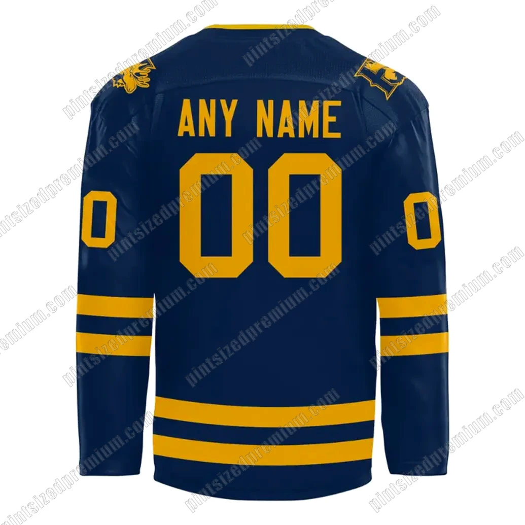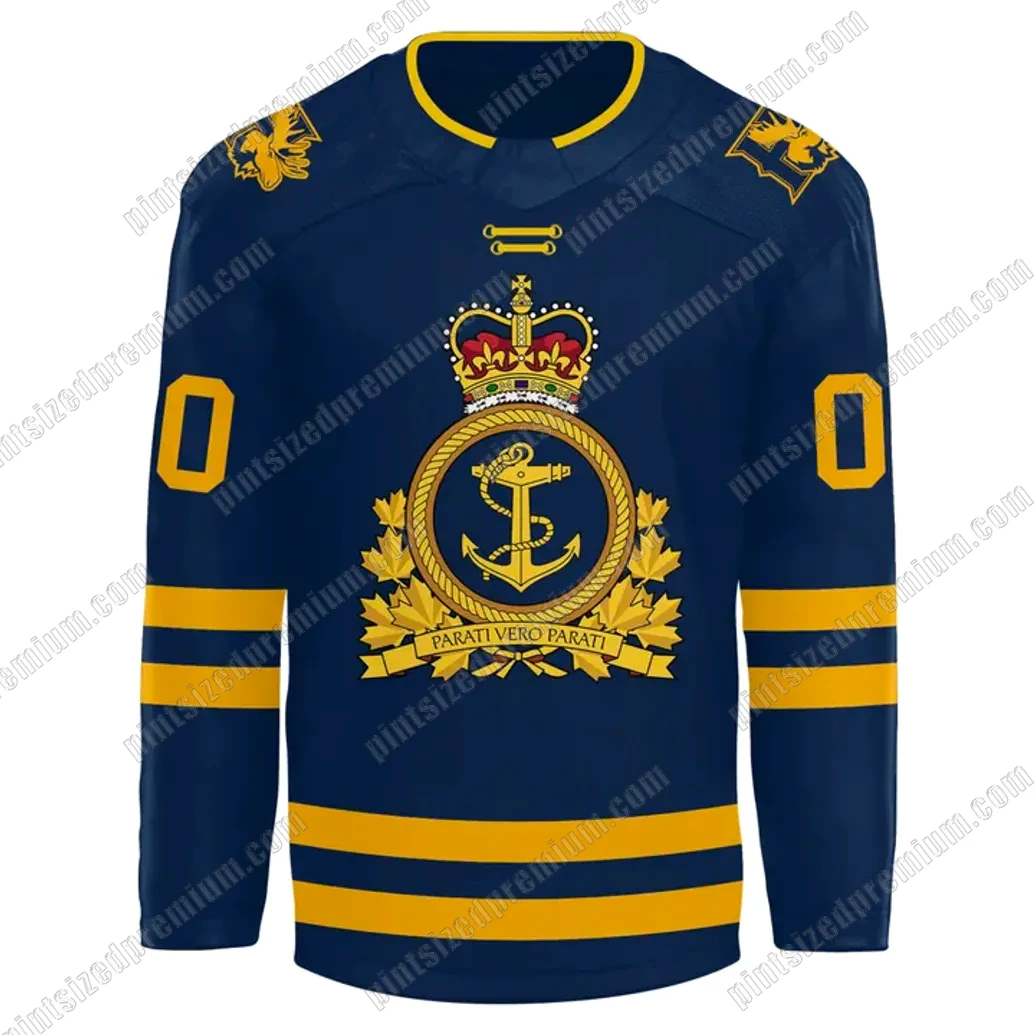 Our commitment at PintSizedPremium is to unparalleled quality and meticulous craftsmanship, evident in every stitch of this premium hockey jersey. The jersey features a sophisticated deep navy blue base, a classic hue that evokes both the rich traditions of maritime service and the distinguished elegance of a professional sports team. This striking foundation is dramatically accented with bold, vibrant gold stripes that adorn both sleeves and the bottom hem, creating a visually dynamic contrast. The centerpiece of this magnificent design is the intricately rendered gold crest proudly displayed on the chest: a majestic anchor crowned with regal splendor, beautifully flanked by detailed maple leaves, and underscored by a banner bearing the Latin motto “PARATI VERO PARATI.” This emblem is a direct, respectful nod to the esteemed heritage and valor associated with national defense, seamlessly integrated with the spirit of Halifax hockey. Further enhancing its unique appeal, the shoulders bear subtle yet powerful golden insignias, including a skillfully incorporated Halifax Mooseheads emblem, ensuring both brand recognition and thematic consistency. Every element, from the robust, breathable fabric chosen for durability and comfort to the precision of the appliqué and embroidery, has been carefully selected to ensure this jersey not only looks exceptional but also withstands the test of time and enthusiastic wear.