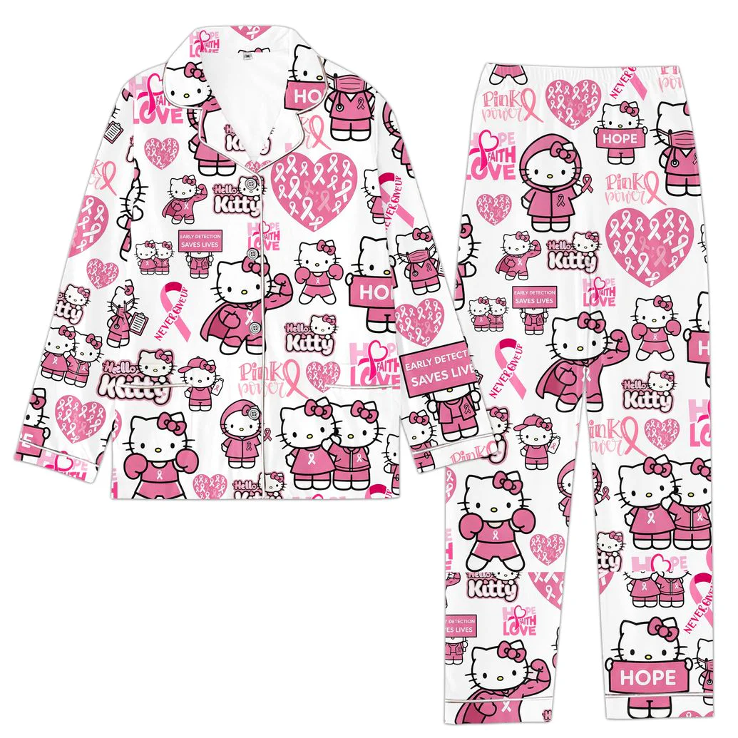 Design elements: All-over print featuring Hello Kitty in various empowering poses, “Pink Power,” “Never Give Up,” “Faith,” “Hope,” “Love” text, and breast cancer awareness ribbons. Classic notched collar, button-front top, long sleeves with cuffs. Matching long pants with an elastic waistband.