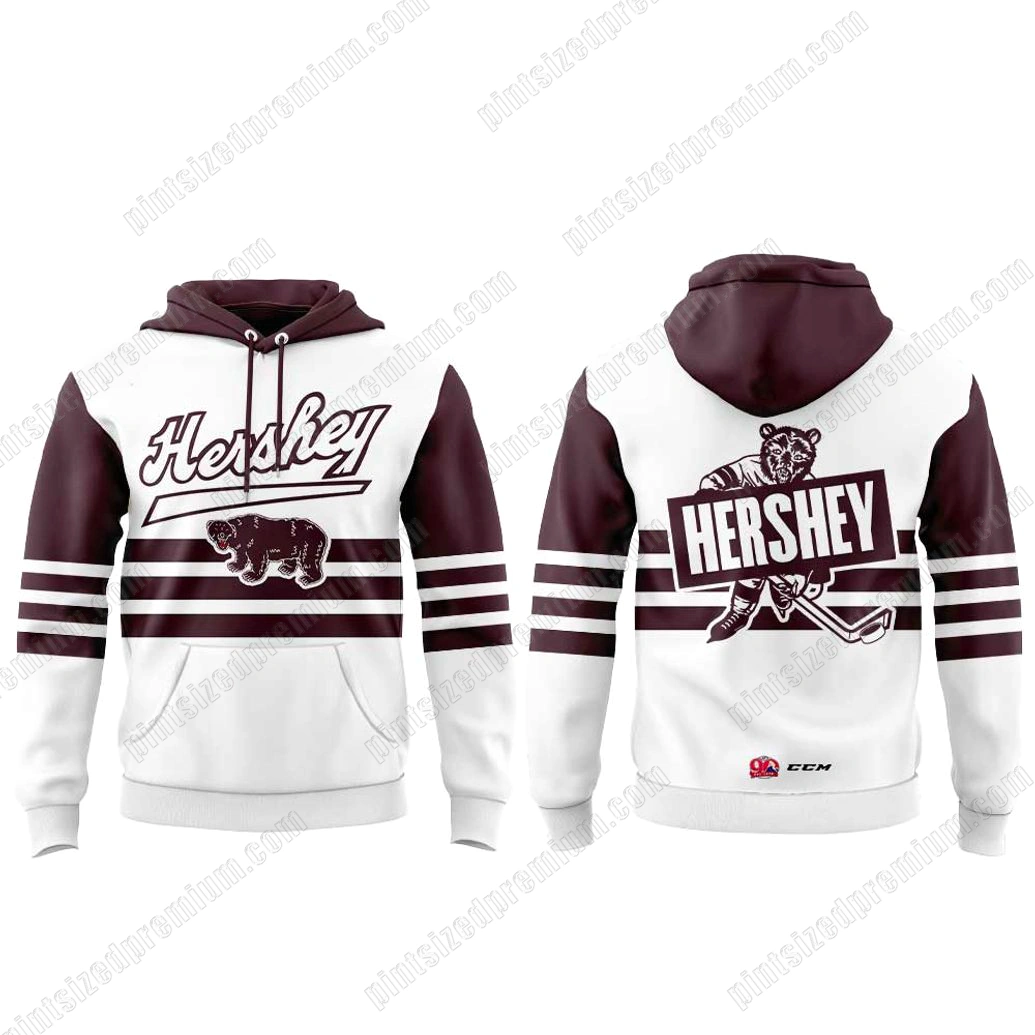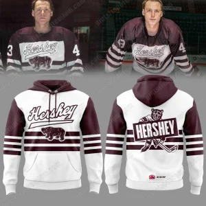 At PintSizedPremium, we believe that true fan merchandise should be as exceptional as the legacy it celebrates. The Hershey Bears 90th Anniversary Season Hoodie is a testament to this philosophy, meticulously designed to capture the essence of the team’s classic aesthetic while offering unparalleled comfort and contemporary style. The iconic maroon and crisp white color scheme, deeply rooted in the team’s visual identity, forms the striking canvas for this premium garment. The front of the hoodie proudly displays the classic “Hershey” script logo, elegantly rendered in white with a subtle outline that gives it a rich, dimensional feel, evoking the timeless charm of vintage sports apparel. Beneath this, a detailed depiction of the walking bear mascot strides confidently, a symbol of strength and tradition. The sleeves feature bold, horizontal maroon stripes against the clean white background, a direct homage to the distinctive design elements found on classic hockey jerseys, marrying athletic heritage with modern street style. Flipping to the back, the design intensifies with a more dynamic representation: a powerful bear figure positioned above a prominent, block-lettered “HERSHEY” logo, underscored by crossed hockey sticks, capturing the competitive spirit of the game. Every stitch, every print, and every detail reflects our commitment to superior craftsmanship, ensuring that the imagery is not only visually stunning but also durable, maintaining its vibrancy wash after wash. The thoughtful integration of these design elements results in a hoodie that is both a nostalgic nod to the past and a stylish accessory for the present.