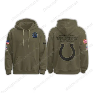At PintSizedPremium, we understand that true fandom demands unparalleled quality and design. The IND Indianapolis Colts 2025 Salute To Service Hoodie exemplifies our commitment to exquisite craftsmanship, blending robust durability with sophisticated aesthetics. This pullover hoodie is rendered in a distinct military-inspired olive green hue, a color choice that immediately evokes a sense of honor and resilience, forming the perfect backdrop for its commemorative design elements. The front proudly features the iconic Indianapolis Colts horseshoe logo, intricately detailed in a vibrant blue and deep black, presented within a distinctive circular emblem on the left chest. This emblem is precisely embroidered, showcasing the sharp lines and rich textures that signify a product of superior quality. On the left sleeve, a meticulously rendered American flag patch stands as a poignant tribute, positioned above additional thematic patches, including a revered football league emblem and another unique design that reinforces the “Salute To Service” message, hinting at military service accolades or symbolic ribbons. The reverse side of the hoodie makes an equally powerful statement with a grand, bold representation of the Colts horseshoe logo in black, outlined with precision against the olive background. Above this emblem, a custom block text print eloquently states “INDIANAPOLIS / COLTS NATIONAL FOOTBALL LEAGUE DIV. AFC EAST IND. EST 1953 SALUTE TO SERVICE,” detailing the team’s legacy and the profound purpose of this special collection. Every stitch, every print, and every patch is executed with an exacting eye for detail, ensuring not just a comfortable fit but a durable garment built to stand the test of time and many seasons of devoted wear. From the robust drawstring for the hood to the spacious kangaroo pocket, every feature is thoughtfully integrated for both functionality and enduring style, asserting this hoodie as a pinnacle of premium fan apparel.