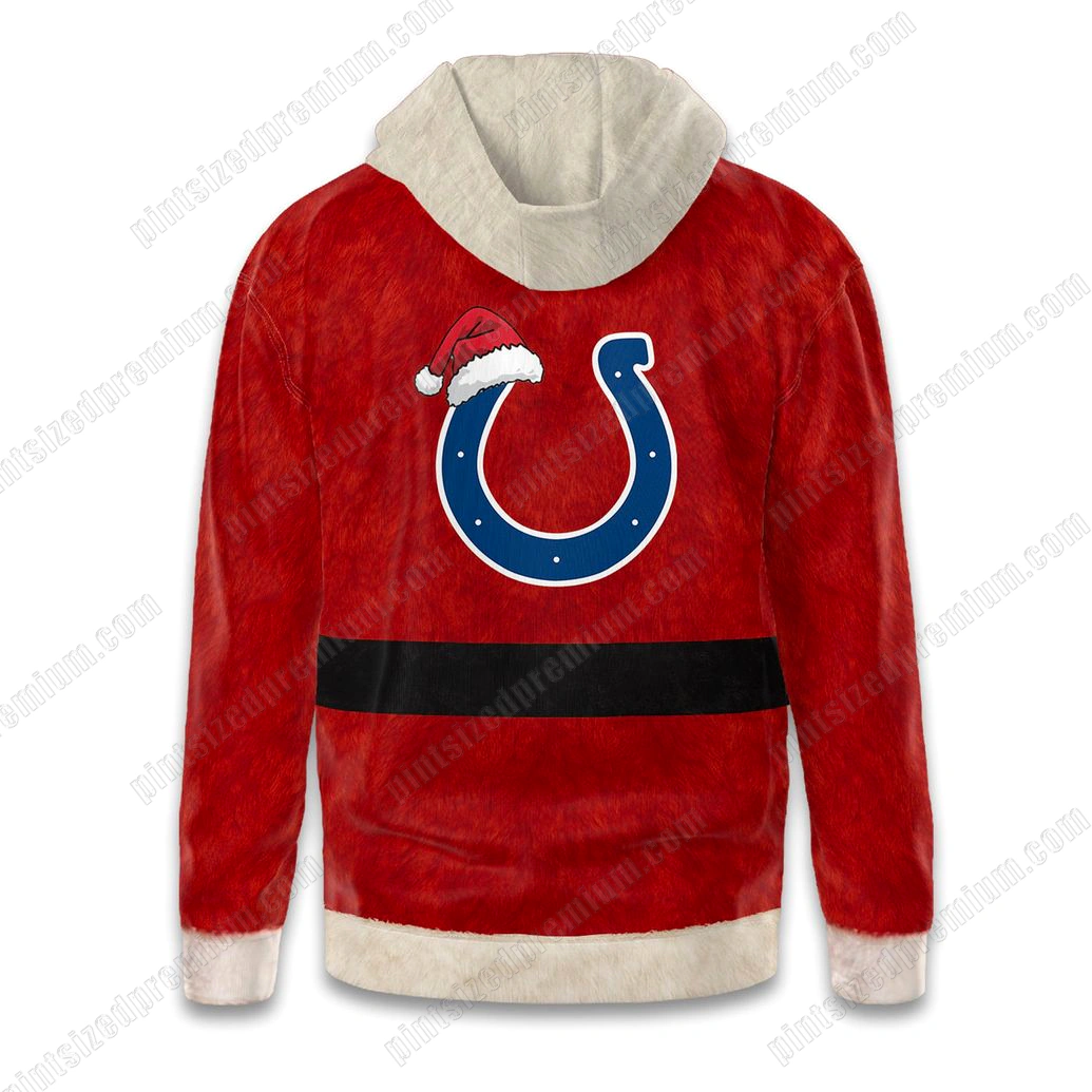 At PintSizedPremium, craftsmanship is at the heart of everything we create, and the Indianapolis Colts Noel Costume Christmas 2025 Hoodie is a testament to our unwavering commitment to quality and innovative design. Our expert artisans have meticulously crafted a piece that beautifully blends festive appeal with authentic team pride. The hoodie’s body boasts a rich, vibrant red, expertly printed with a plush, faux fur texture that perfectly emulates the classic Santa Claus suit, ensuring you feel both festive and cozy. Complementing this luxurious texture are the crisp, stark white faux fur trim details, gracing the cuffs, the hem, and tracing the entire front opening, including the soft, comfortable hood lining, which adds an authentic holiday silhouette. A striking black belt, complete with a gleaming gold square buckle, is seamlessly integrated into the front design, completing the iconic holiday ensemble. The reverse of the hoodie proudly showcases the legendary Indianapolis Colts horseshoe logo, rendered in its signature bold blue with a clean, sharp white outline. Perched playfully atop the horseshoe is a charming mini Santa hat, a delightful detail that perfectly symbolizes the joyful union of team loyalty and holiday cheer. Every stitch, every detail, and every vibrant hue are designed to offer unparalleled comfort, durability, and a visual impact that truly sets PintSizedPremium apart as the leader in premium crossover fan merchandise.