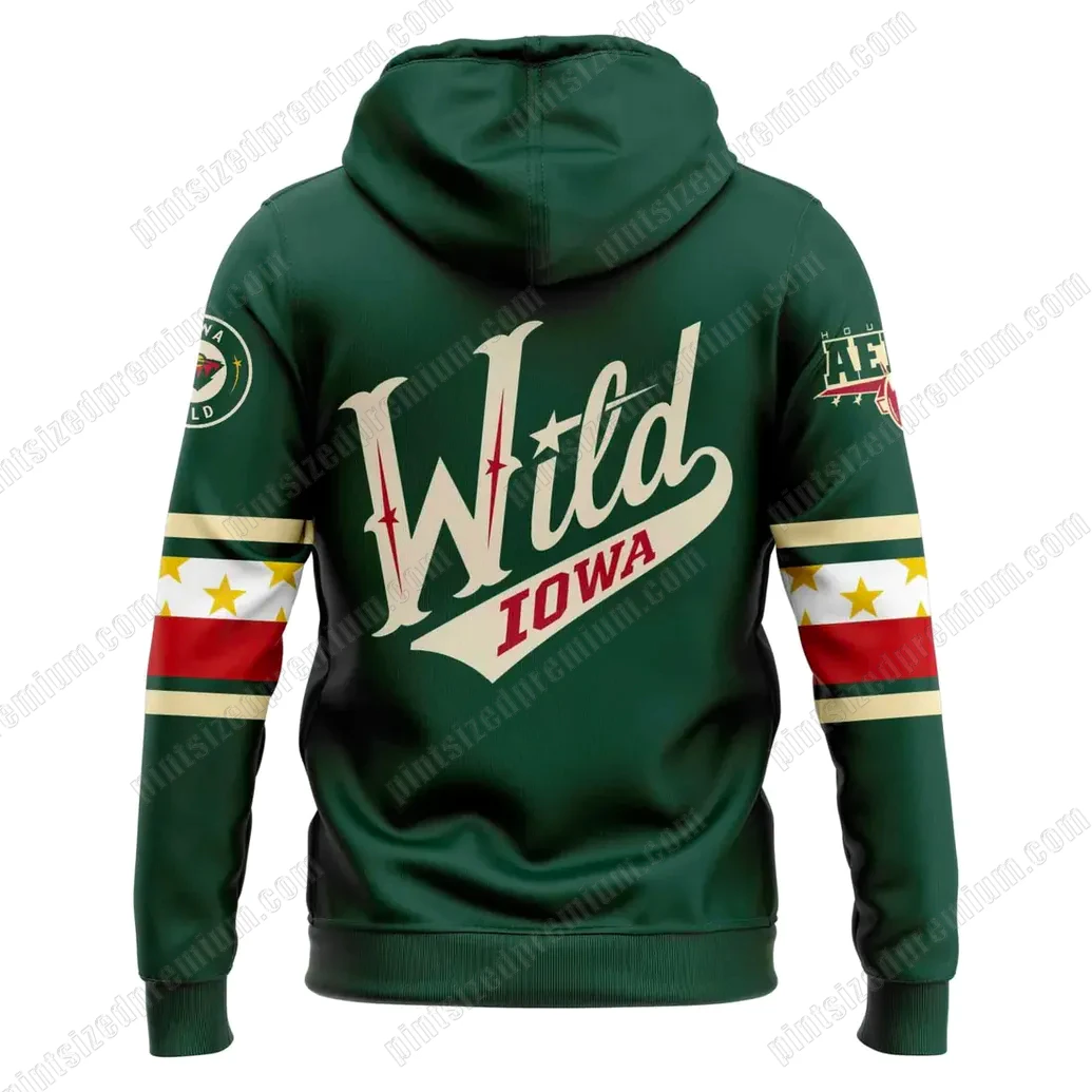 At PintSizedPremium, we understand that true fandom demands apparel that not only looks exceptional but feels incredible and endures through countless moments of passion. The Iowa Aeros 2025 Veterans Appreciation Night New Hoodie exemplifies this commitment to unparalleled craftsmanship. Its rich, deep forest green hue forms the perfect canvas, evoking both the rugged spirit of the outdoors and the vibrant energy of the ice. The centerpiece is the meticulously rendered front graphic: a striking interpretation of the Aeros logo, featuring the bold ‘IOWA AEROS’ lettering crowned by a radiant yellow star, and the formidable, toothy bomber plane, a symbol of strength and precision, encircled by a crisp white outline that pops against the dark green. This isn’t a mere print; it’s a statement, designed with premium, fade-resistant techniques to ensure its iconic imagery remains sharp and vivid for years to come. The sleeves are a masterclass in detail, adorned with distinctive horizontal stripes of rich cream, bold red, and further cream bands, interspersed with bright yellow stars that add a touch of celebratory flair and patriotism. These elements are strategically placed, reflecting the structured yet dynamic aesthetics of classic athletic wear. The reverse side of the hoodie features a dramatic, vintage-inspired script of ‘Wild’ in a warm cream tone, subtly outlined in red, with ‘IOWA’ elegantly placed beneath, an artistic nod to the state’s deep roots in the team’s identity. Small, detailed team insignias are thoughtfully placed on the upper sleeves, adding layers of authenticity and collector appeal. Constructed from a superior blend of soft, breathable, and durable fabric, this hoodie boasts a plush interior for ultimate comfort, a sturdy kangaroo pocket for practicality, and adjustable white drawstrings for a perfect fit. Every stitch, every color choice, and every graphic placement has been curated to create a piece that stands apart in quality and design.