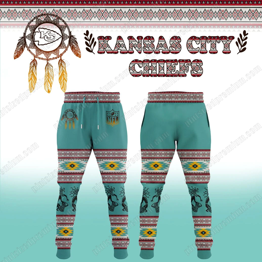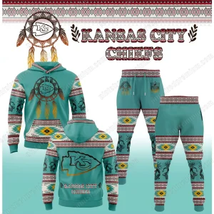 At PintSizedPremium, our commitment to exceptional craftsmanship and thoughtful design shines through every stitch and pattern of this unique hoodie. This pullover masterpiece begins with a striking teal base, a canvas reminiscent of vast desert skies and ancient waterways, providing a vibrant backdrop for its intricate details. The front proudly features a large, beautifully rendered dreamcatcher design, gracefully encircling the iconic Kansas City Chiefs “KC” logo. Adorned with delicately depicted feathers, the dreamcatcher evokes protection, dreams, and the sacred connection to nature. Extending across the sleeves and hem, a meticulously woven pattern of Southwestern geometric motifs unfolds, a tapestry of tradition in earthy tones of deep red, cream, sun-kissed yellow, and grounding dark blue. These patterns are not merely decorative; they tell stories, echoing generations of artistry and symbolic meaning. Adding another layer of cultural depth, stylized figures are integrated into the design along the sides and lower sleeves, appearing to dance and drum, echoing ancient narratives and celebratory rhythms. The hoodie is completed with a comfortable drawstring hood and a practical front pouch pocket, blending premium comfort with iconic style. On the back, a bold, oversized “KC” logo, outlined in a lustrous golden hue, commands attention, asserting your team allegiance with undeniable pride, complemented by the “KANSAS CITY CHIEFS” text below, flanked by elegant decorative leaf flourishes. Every element is designed for visual impact and profound storytelling, ensuring an authentic and premium fan experience.