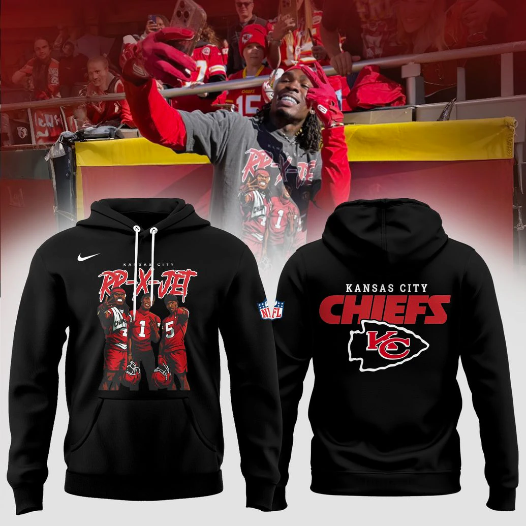 The Kansas City Chiefs Pr X Jet T-Shirt from PintSizedPremium is a masterclass in design, blending premium craftsmanship with a bold artistic vision. Fashioned from superior, comfortable fabric, this black tee serves as the perfect canvas for its striking graphics. The front immediately captures attention with the bold “KANSAS CITY” text positioned proudly at the top, setting the stage for the centerpiece: the unique “Pr X Jet” graphic rendered in a vibrant, stylized red font that exudes modern edge and power. Beneath this, a captivating illustration depicts three iconic figures in dynamic, action-ready poses, their jerseys emblazoned with the unmistakable numbers 1 and 5, rendered with graphic novel intensity. Every line and shadow is meticulously printed, ensuring a crisp, lasting image that withstands the test of time and countless celebrations. The reverse side of the T-shirt is equally impactful, featuring the “KANSAS CITY” identifier alongside a massive, commanding “CHIEFS” in brilliant red, underlining the team’s dominant presence. Below this, the iconic Kansas City arrowhead logo, with its distinct white outline and red fill encasing the bold “KC,” reinforces your connection to the team’s storied history and bright future. PintSizedPremium’s dedication to quality is evident in every stitch and every precise print, guaranteeing a garment that feels as premium as it looks, designed to maintain its vibrant colors and structural integrity wash after wash.
