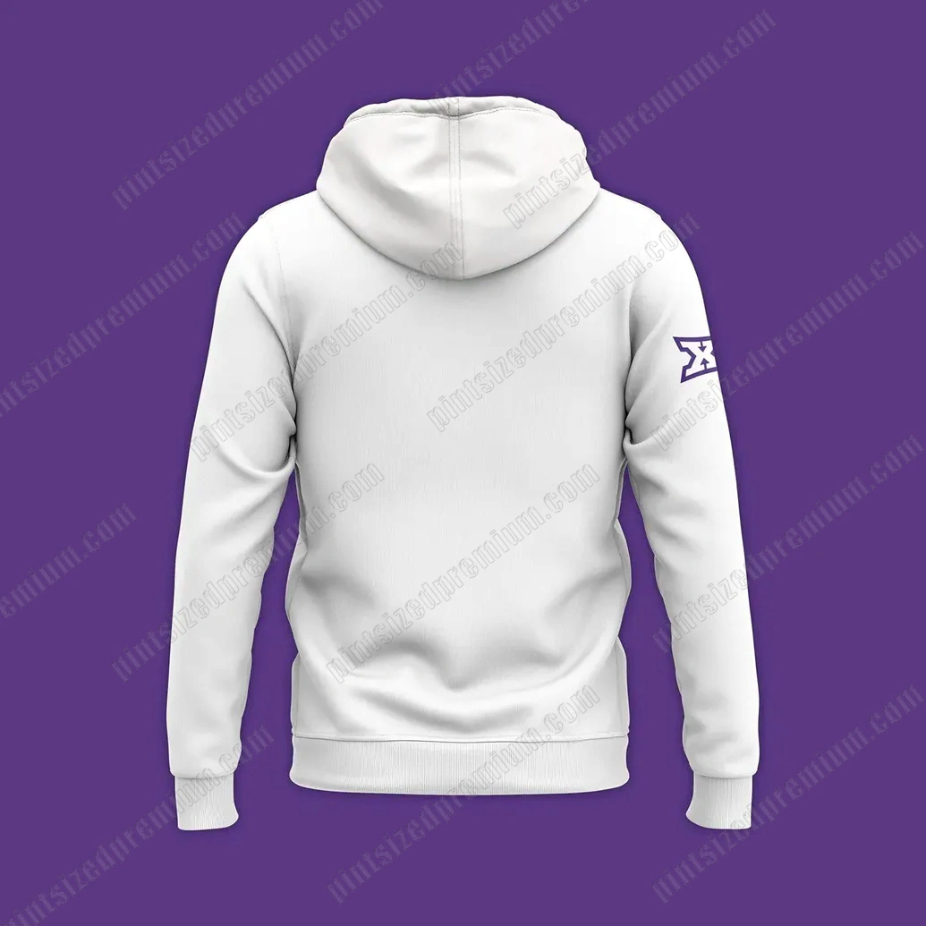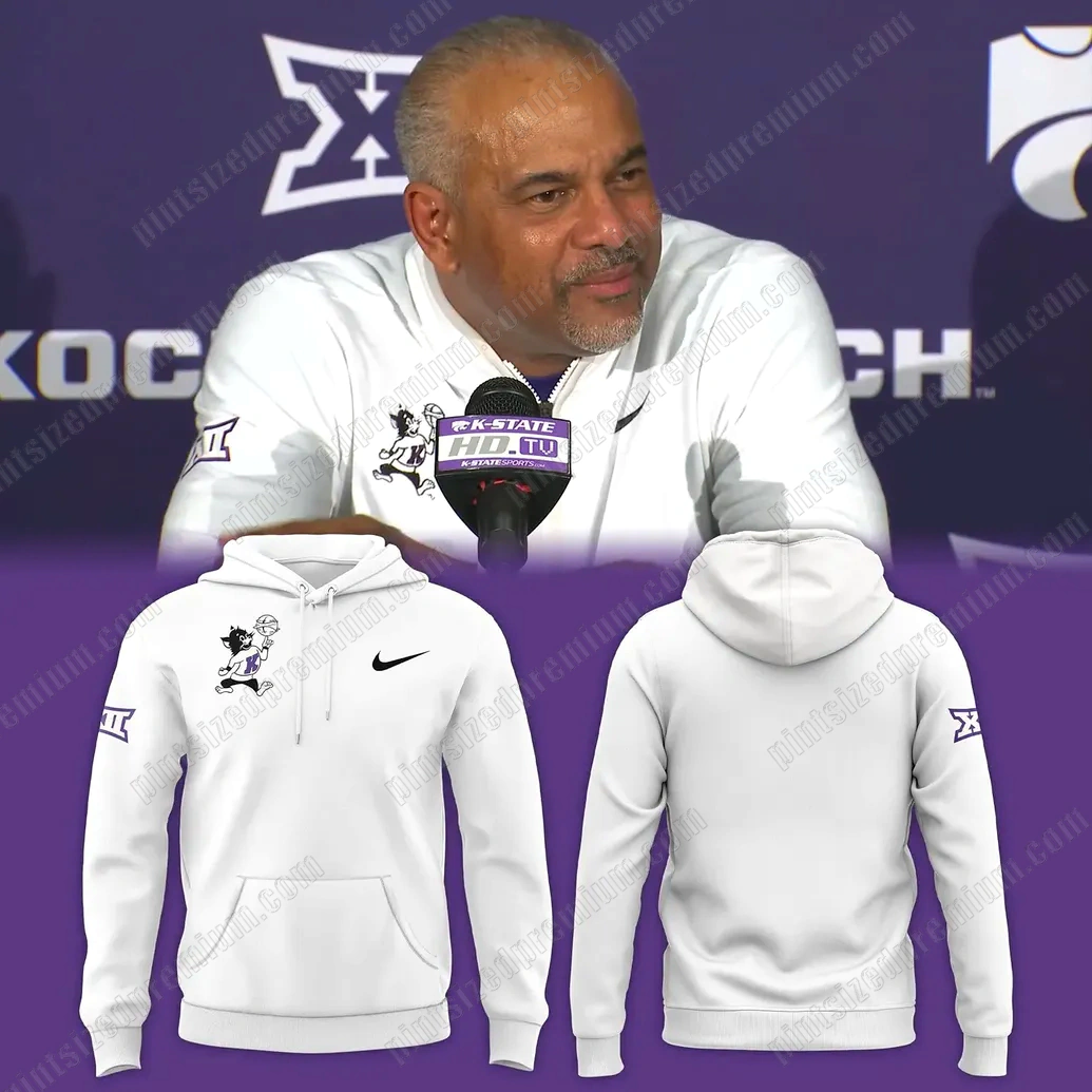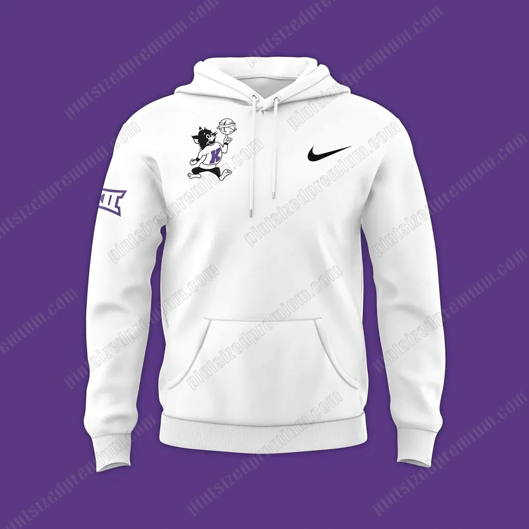 Crafted with meticulous attention to detail and designed for the discerning fan, the Kansas State Men x Coach Jerome Tang Limited Hoodie exemplifies PintSizedPremium’s commitment to superior quality and distinctive design. The pristine white base of the hoodie serves as a clean, vibrant canvas, allowing the iconic team and coaching elements to truly pop. On the left chest, a charming and energetic depiction of the beloved wildcat mascot, rendered in crisp black and white, bounds forward, clutching a basketball featuring the signature “K” letter, perfectly capturing the playful yet determined spirit of the team. Adjacent to this spirited graphic, on the right chest, rests a sleek, universally recognized athletic emblem, presented in a bold black outline, signifying excellence and dynamic performance without compromise. Further enhancing its unique appeal, the left sleeve proudly showcases the distinctive, geometric powercat insignia, rendered in a rich, regal purple, strategically placed to offer a subtle yet powerful nod to the university’s enduring heritage. Every element, from the robust, soft-touch fabric chosen for comfort and durability, to the precision of the printed graphics and the integrated drawstring hood and convenient kangaroo pocket, speaks volumes about the craftsmanship. This hoodie is built not just to be worn, but to be experienced, maintaining its premium feel and vibrant aesthetics through countless cheers and celebrations.