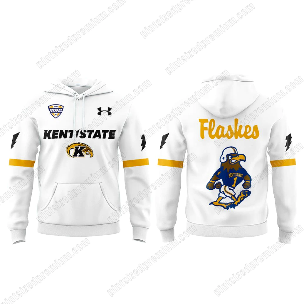 PintSizedPremium’s commitment to superior craftsmanship is evident in every stitch and print of this exclusive 2025 Edition apparel. The crisp white base of both the T-shirt and Hoodie provides a striking canvas for the iconic Kent State colors and emblems. The front proudly displays “KENT STATE” in bold, commanding black lettering, underlined by the distinguished stylized ‘K’ Golden Flashes mascot logo, embodying the athletic prowess and academic excellence of the institution. Flanking these central elements, the official MAC (Mid-American Conference) logo signifies collegiate athletic prestige, while sleek black lightning bolt graphics dynamically adorn the sleeves, a direct nod to the ‘Flashes’ moniker. A vibrant gold stripe at the sleeve cuffs of the T-shirt and across the forearms of the Hoodie adds a brilliant contrast, reflecting the Golden Flashes’ signature hue. Turning to the back, the apparel truly shines with “Flashes” boldly rendered in an elegant, sweeping gold script, exuding a sense of movement and energy. Below, the beloved Golden Flashes mascot leaps into action – a dynamic eagle in a blue jersey emblazoned with “KENT STATE” and the number ‘1’, complete with a helmet, white pants, and gold shoes. Every detail, from the precise color matching of the gold and blue to the sharp, durable printing technique, ensures a vibrant and lasting representation of your Kent State loyalty. The choice between the lightweight T-shirt and the cozy Hoodie provides versatile options, crafted from premium materials designed for comfort, breathability, and enduring quality, whether you’re braving the elements or simply enjoying a casual day out.