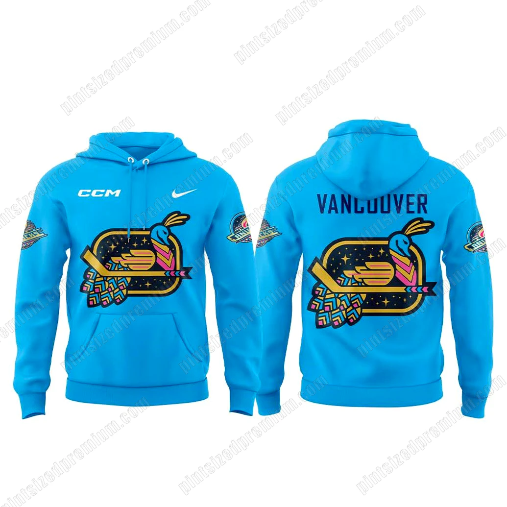 At PintSizedPremium, we believe true fandom is expressed through quality and distinct design. The Limited Vancouver Canucks Celebrating Diwali Night 2025 Hoodie is a testament to this philosophy, designed to capture attention and inspire conversation. Crafted from a luxurious, ultra-soft fabric in a striking, vibrant sky-blue hue, this hoodie offers both supreme comfort and lasting durability, perfect for chilly game nights or festive outdoor gatherings. The centerpiece of this magnificent piece is the intricately designed fusion logo, boldly displayed across the chest and again on the back. This emblem features a majestic, stylized bird – reminiscent of a peacock, a symbol of beauty and prosperity – gracefully intertwined with a classic hockey stick. The logo is set against a deep, starry night sky backdrop, embodying the festival of lights, while the hockey stick itself bursts with dynamic geometric patterns in a vivid palette of pinks, oranges, yellows, and greens, reflecting traditional artistry. Smaller, circular versions of this unique design adorn each sleeve, adding a touch of consistent elegance. On the back, above a larger iteration of the fusion emblem, the word “VANCOUVER” is proudly emblazoned in bold, impactful lettering, cementing your allegiance to the city and its cherished team. Every stitch, every color choice, and every design element is thoughtfully integrated to create a garment that is as much a work of art as it is a comfortable, stylish hoodie.