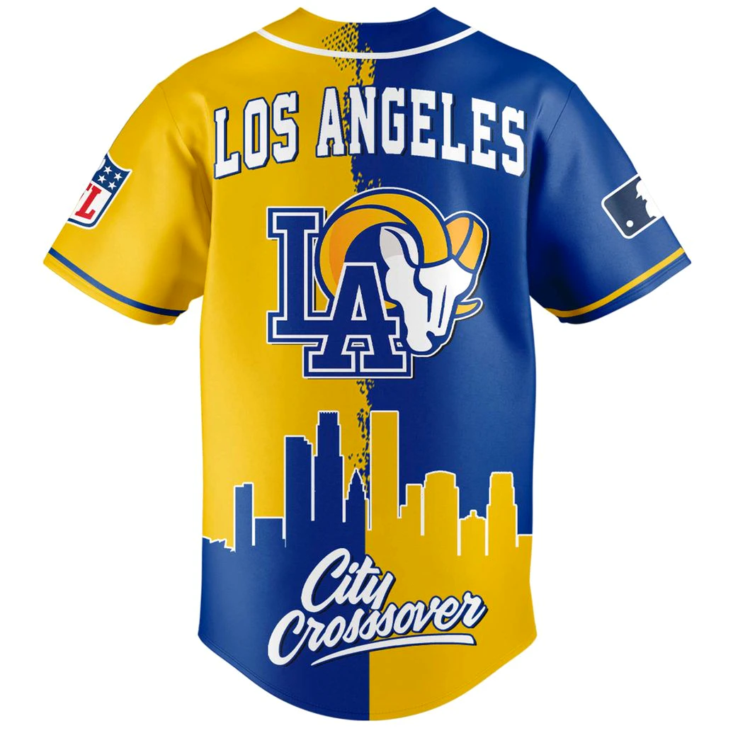 The Los Angeles City Crossover Baseball Jersey represents a masterclass in design, meticulously crafted to unite LA’s cherished sports cultures. Its striking split design features a deep royal blue seamlessly meeting vibrant golden yellow, bisected by a unique, subtly distressed vertical line that adds an urban edge. On the front, the iconic stylized ‘LA’ script (baseball’s legacy) commands the royal blue half, while the powerful ‘LA’ logo with a majestic ram’s head (football’s pride) adorns the golden yellow side. Uniting these symbols, the elegant ‘Los Angeles’ script gracefully arches across the chest, embodying the city’s unified spirit. A full button-up front offers classic baseball authenticity and versatile wearability, complemented by distinct league patches on each sleeve that emphasize the crossover narrative. On the back, ‘LOS ANGELES’ is emblazoned boldly across the shoulders. Below, a prominent ram’s head ‘LA’ emblem anchors the design, expertly overlaying the split colors. The jersey’s base features a stunning silhouette of the iconic Los Angeles skyline, a tribute to its majestic landscape. Within this urban panorama, the ‘City Crossover’ script provides the perfect conceptual capstone. Every element, from precision printing to vivid color saturation, is executed with PintSizedPremium’s unwavering commitment to exceptional quality, ensuring a garment that stands out in both design and durability.
