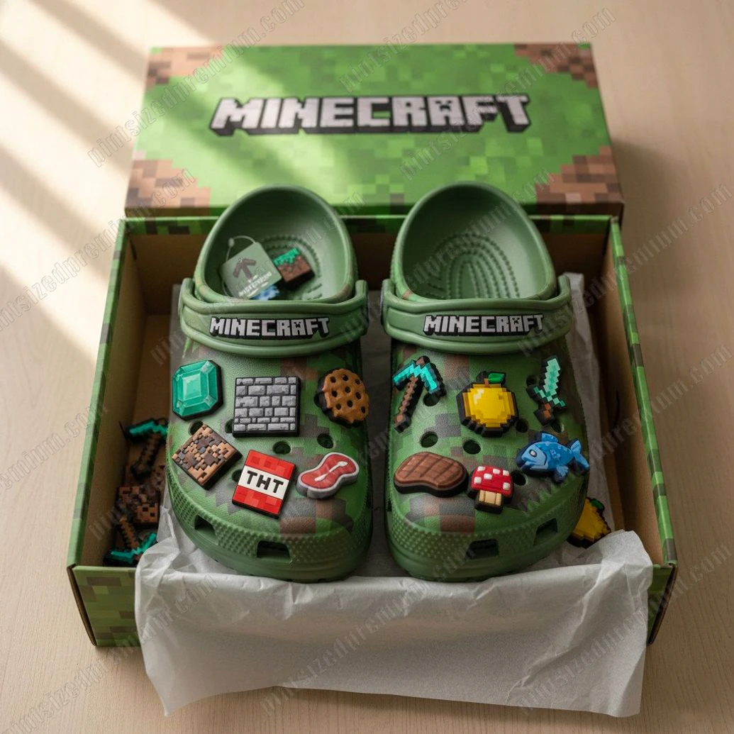 At PintSizedPremium, we understand that true craftsmanship goes beyond mere aesthetics; it is about capturing the essence of a phenomenon and translating it into a tangible, high-quality product. The Minecraft Icon New Edition Clogs are a testament to this philosophy, meticulously designed to transport you directly into the pixelated world with every detail. Each pair features a distinctive base hue, a rich, iconic green that instantly evokes images of lush grass blocks and the endless possibilities of the Overworld. This vibrant foundation is further enhanced by a subtle yet captivating block-patterned upper, reminiscent of the game’s familiar dirt and stone textures, creating an immersive visual experience. But the true magic lies in the collection of bespoke, attachable charms that adorn these exceptional clogs. Each charm is a miniature work of art, representing beloved in-game items: the unmistakable pixelated pickaxe, ready for mining expeditions; the legendary sword, poised for battle; a delicious cookie, perfect for a quick snack; a hearty piece of steak for sustenance; the explosive TNT block, a nod to both destruction and creation; a vibrant emerald gem, a symbol of rarity and trade; and textured stone and wood blocks, the very building blocks of your virtual world. These intricately crafted charms are not merely decorations; they are tactile representations of your journey, engineered with durable materials and vibrant colors that pop, ensuring they stand out whether you are at a gaming convention or simply enjoying a casual day out. The classic “MINECRAFT” logo is proudly emblazoned on the strap, a bold declaration of authenticity and premium quality, all presented within a custom-designed, themed box that makes the unboxing experience an event in itself, cementing its status as a true collector’s gem.