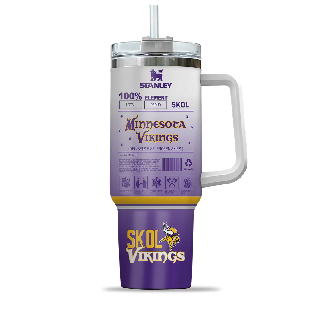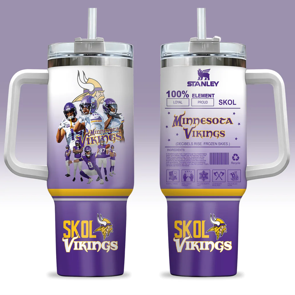 At PintSizedPremium, exceptional quality is paramount for true fandom. This Minnesota Vikings Football Tumbler, a 40oz masterpiece, is crafted from robust, food-grade stainless steel with double-wall vacuum insulation. This design ensures beverages stay ideally cold or warm for hours, perfect for any game day or weather. Every detail celebrates the Vikings’ legacy: a vibrant gradient transitions from purple to white and gold, setting a dynamic backdrop. The front showcases a compelling collage of Minnesota Vikings players in action, the “Minnesota Vikings” wordmark, and the iconic “SKOL Vikings” logo. The reverse side features unique thematic graphics – bold loyalty statements, a creative “ingredients” label, and distinct fan-centric symbols. An ergonomic, integrated carry handle enhances portability, while a secure, spill-resistant lid with a reusable straw adds convenience and sustainability to your fan expression.