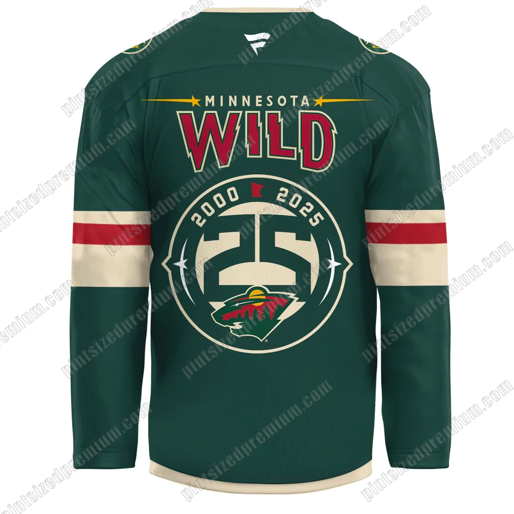 PintSizedPremium meticulously crafts each piece, ensuring that this Minnesota Wild 25th Anniversary Heritage Jersey is a masterpiece of design and quality, directly inspired by the rich history it celebrates. The garment is anchored by a deep, resonant forest green, a color that immediately evokes the lush, natural beauty of Minnesota’s wilderness, perfectly aligning with the team’s identity. This verdant base is elegantly contrasted by a bold, wide cream-colored stripe and a thinner, vibrant red accent stripe that encircles the lower sleeves and waist, a classic heritage motif that adds a timeless, distinguished feel. At the heart of the jersey’s design, on the chest, lies the stunning 25th Anniversary crest, an intricate circular emblem that demands attention. Here, the number “25” is cleverly stylized, subtly integrating elements reminiscent of hockey sticks or skates, creating a dynamic visual that celebrates the sport’s essence. Nestled beneath this anniversary marker is the iconic Minnesota Wild animal head logo, beautifully rendered with its signature depiction of a captivating forest sunset, silhouetted trees, and serene waters, all within its powerful form. Encircling these central elements are the precise dates “2000” and “2025,” marking the quarter-century milestone. The back of the jersey mirrors this exceptional craftsmanship, proudly featuring “MINNESOTA” in gold lettering above a bold “WILD” in red, outlined in green, alongside a second, equally detailed 25th Anniversary crest. Even the circular shoulder patches, displaying a stylized animal head and the “WILD” text, speak to an unparalleled attention to every nuanced detail, all constructed from premium, durable, and comfortable fabric, designed for lasting wear and enjoyment.