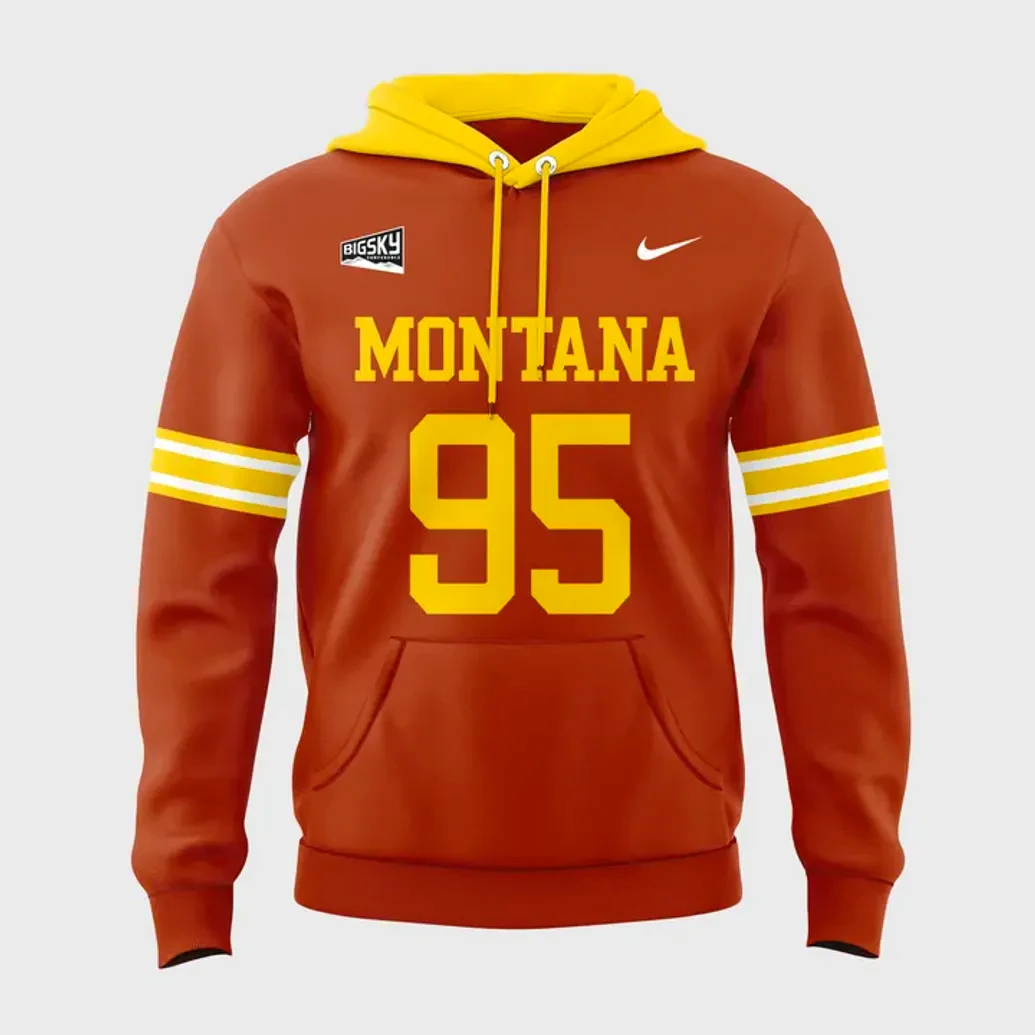 PintSizedPremium’s commitment to superior craftsmanship is evident in every stitch and detail of this Montana Grizzlies Football 2025 Limited Orange Hoodie. Crafted from high-quality, ultra-soft fabric, this hoodie promises both lasting comfort and durability, making it perfect for those chilly game days or cool Montana evenings. The striking burnt orange base color, rich and iconic, serves as a canvas for the vibrant yellow accents that immediately catch the eye. On the front, bold “MONTANA” lettering is prominently displayed above a striking “95”, both rendered in a vibrant yellow, symbolizing not just a number, but potentially a cherished moment or an enduring legacy within Griz lore. A subtle athletic emblem and the distinctive “BIGSKY” conference logo are thoughtfully placed, signifying authenticity and your connection to collegiate sports. The reverse side is equally impressive, featuring a sweeping, stylized “Griz” script in bright yellow, proudly declaring “FOOTBALL” beneath it. The hood lining reveals a playful, repeating pattern of two animated brown bear mascots, adding a unique, spirited touch. Clean white stripes adorn both sleeves, completing the classic athletic look. This meticulous attention to design ensures that your Montana Grizzlies Football 2025 Limited Orange Hoodie is not just comfortable, but also a true statement piece that stands out in any crowd, perfectly blending athletic aesthetics with premium fan fashion.