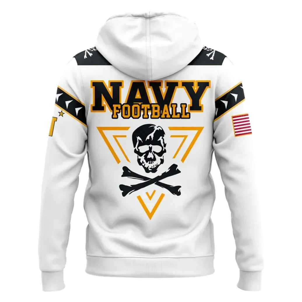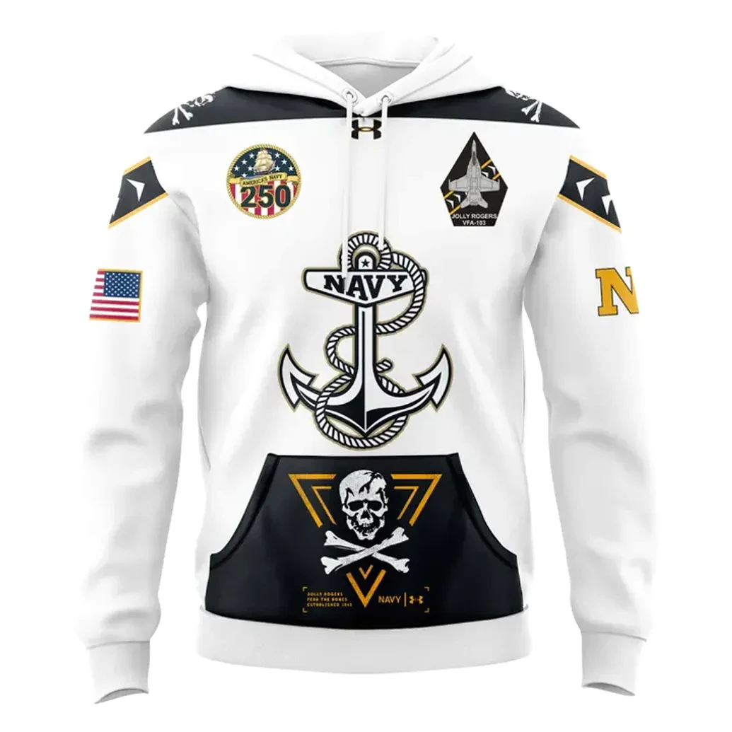 Crafted with the meticulous attention to detail that PintSizedPremium is renowned for, this hoodie is a masterwork of design, where every element contributes to its powerful narrative. The crisp white base serves as a striking canvas, symbolizing purity and unwavering resolve, perfectly accentuated by bold black, gold, and vibrant red and blue details. The front proudly features a majestic anchor, intertwined with the iconic NAVY lettering, a timeless emblem of maritime strength and stability. Below, a distinctive black section highlights a skull and crossbones motif, elegantly framed within a gold triangle, nodding to the daring spirit of the Jolly Rogers and their fearless legacy. Discreetly integrated on the upper chest are powerful emblems: a circular badge commemorating the United States Navy’s 250th anniversary, established in 1775, complete with a classic ship silhouette, alongside a dynamic triangular patch celebrating the VFA-103 Jolly Rogers squadron, featuring an F/A-18 Super Hornet in flight. On the left sleeve, the stars and stripes of the American flag stand as a vivid testament to patriotism, while the right sleeve proudly displays a golden “N.” The shoulders and sleeves are adorned with a striking black and white triangular pattern, adding a contemporary edge to the classic iconography. The back of the hoodie makes an equally commanding statement, emblazoned with “NAVY FOOTBALL” in prominent black and gold lettering, positioned above another powerful skull and crossbones design within a matching gold triangle, reinforcing the team’s fierce determination. This intricate artwork is rendered with superior print quality, ensuring each vibrant color and sharp line remains pristine, reflecting the robust quality and longevity expected from premium fan merchandise.