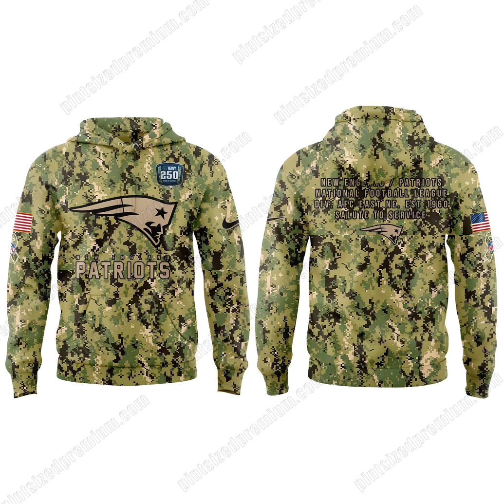 Crafted with meticulous attention to detail, the New England Patriots 2025 Salute to Service Navy 250 Hoodie is a testament to superior design and enduring quality. The eye is immediately drawn to its striking digital camouflage pattern, a sophisticated blend of earthy green, rich brown, deep black, and subtle tan pixels that create a dynamic and authentic military aesthetic. This carefully chosen palette provides a robust backdrop for the iconic New England Patriots logo, prominently displayed on the front, symbolizing the unwavering strength and legacy of the team. Just above, a distinguished NAVY 250 YEARS OF SERVICE emblem stands as a proud declaration, its crisp design reflecting a quarter-millennium of heroism. On the wearer’s left sleeve, a beautifully rendered US flag patch signifies patriotism and unity, a consistent thread throughout the Salute to Service collection. The reverse of the hoodie continues this narrative of honor and team pride. A larger, equally prominent NAVY 250 YEARS OF SERVICE emblem reinforces the tribute, while a detailed text block proudly proclaims NEW ENGLAND PATRIOTS NATIONAL FOOTBALL LEAGUE DIV: AFC EAST NE. EST 1960 SALUTE TO SERVICE, meticulously outlining the team’s esteemed heritage and commitment to appreciation. Below this, a subtle yet powerful rendition of the Patriots logo reaffirms allegiance. Every stitch and every print on this hoodie speaks to PintSizedPremium’s dedication to craftsmanship. The fabric itself is chosen for both comfort and resilience, ensuring that its vibrant graphics and intricate details withstand the test of time, season after season. The generous hood provides comfort and versatility, while the spacious kangaroo pocket offers practical utility, perfect for keeping hands warm or stashing essentials. This is not merely printed merchandise; it is an artful fusion of heritage and contemporary design, designed for the fan who appreciates the finer points of premium apparel.