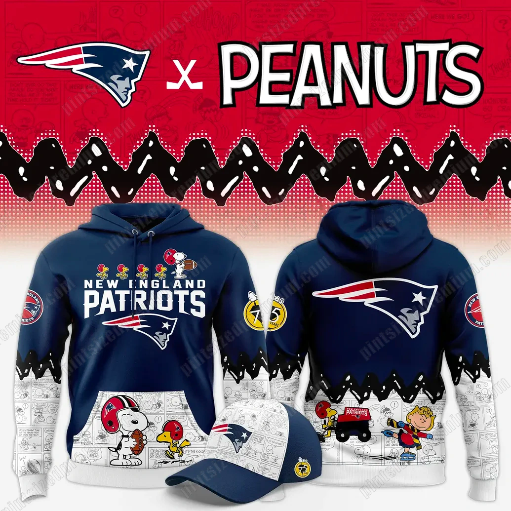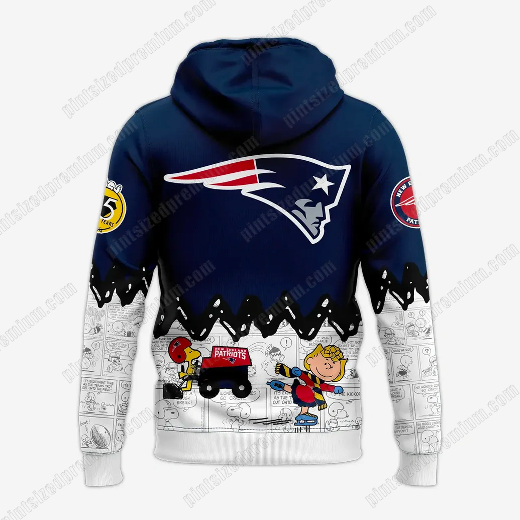 PintSizedPremium is synonymous with unparalleled quality and imaginative design, and this premium New England Patriots Peanuts Night Limited Hoodie is a shining example of our commitment to excellence. Every detail is thoughtfully integrated, creating a garment that is as rich in narrative as it is in craftsmanship. The hoodie’s primary canvas is a deep, classic navy blue, instantly recognizable as the foundation of the New England Patriots’ iconic color scheme. Across the chest, the bold “NEW ENGLAND PATRIOTS” text stands out in crisp white, elegantly underlined by the legendary Flying Elvis logo, its red, white, and blue stripes symbolizing decades of unwavering success. Above this powerful declaration, a whimsical detail captivates the eye: miniature Peanuts characters, including Snoopy and Woodstock, playfully adorned in tiny football gear, injecting a delightful and unexpected layer of charm. The lower front and extending across the sleeves reveal a dynamic black and white comic strip pattern, showcasing various Peanuts characters in their signature poses and expressions, reminiscent of their most beloved adventures. This artistic backdrop provides a delightful contrast to the solid navy, with a particularly endearing scene on the front pocket area featuring Snoopy in a football helmet, cradling a football, accompanied by his loyal sidekick Woodstock. The back of the hoodie mirrors the front’s navy expanse, emblazoned with a larger, commanding Flying Elvis logo, ensuring your team allegiance is proudly displayed from every angle. Below this, the comic strip pattern resumes, depicting more Peanuts characters, including Charlie Brown and Linus, alongside Snoopy driving a fun “Patriots” branded vehicle, further cementing the crossover theme. Unique design elements include a striking jagged black “drip” effect that visually connects the navy body to the white-trimmed comic strip sleeves and lower hem, adding a modern, artistic edge. Circular patches adorn the sleeves: a patriotic “New England Patriots” emblem on the right, and a distinctive yellow “75 YEARS” patch, featuring a charming Peanuts character, on the left, celebrating a significant milestone. Crafted from a premium, durable, and comfortable fabric, this hoodie boasts high-definition printing that ensures the vibrancy of colors and the intricate detail of every character remain pristine, wash after wash.