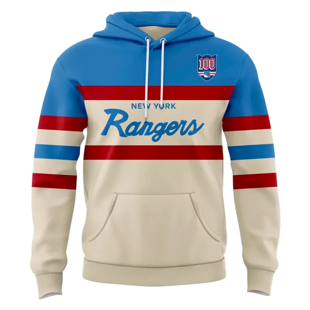 Beyond its superior construction, this New York Rangers Centennial Hoodie is engineered for dynamic fan life. Providing lightweight warmth, it serves as a perfectly comfortable midlayer on chillier days or stands boldly alone as a primary statement piece. Its versatility makes it the ideal companion for any scenario: from the electric atmosphere of the stadium, where every cheer resonates with your spirit, to the casual comfort of a concert or a relaxed day out. Its unique design, featuring the classic blue, red, and cream palette with the iconic “NEW YORK Rangers” script on the front and the striking diagonal “RANGERS” on the back, along with the special “100” Centennial crest, allows you to represent your team with unmistakable style. Whether you’re partaking in game-day rituals, expressing your fandom at a cosplay event, or simply enjoying everyday activities, this hoodie seamlessly blends into your lifestyle, always radiating your Rangers pride.