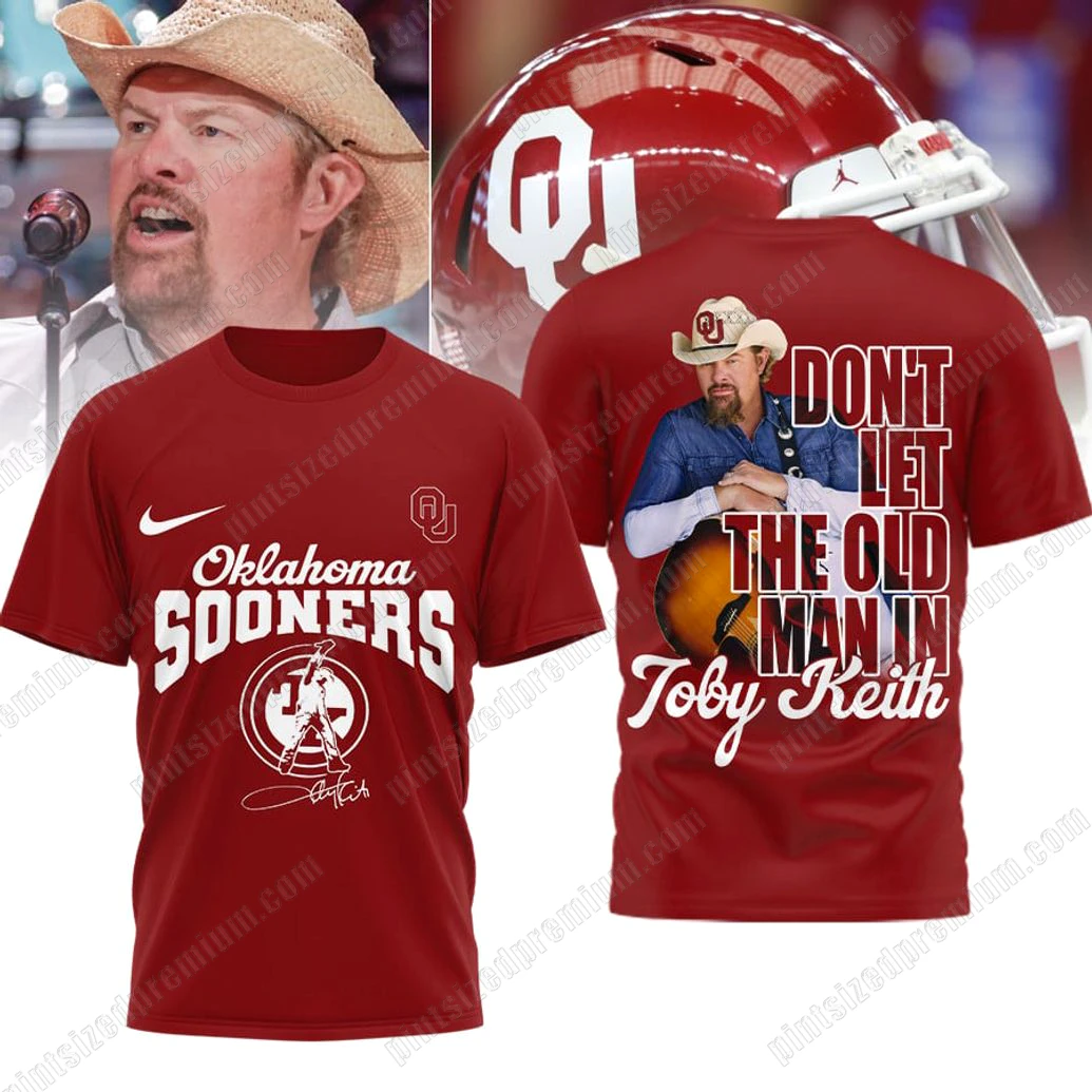PintSizedPremium is renowned for its dedication to superior craftsmanship, and the Oklahoma Sooners X Toby Keith Fans Will Love T-Shirt exemplifies this commitment through every meticulously designed detail. Crafted from premium, breathable fabric, this T-shirt offers unmatched comfort and durability, ensuring it stands up to countless game days, concerts, and casual wear. The front of the shirt proudly displays “Oklahoma Sooners” in a bold, iconic collegiate font, instantly recognizable and radiating team pride. Below this striking text, a unique circular graphic captures the essence of this extraordinary crossover, featuring an artistic depiction of a figure holding a musical instrument or microphone, accompanied by a distinctive signature, subtly blending the worlds of sport and music. A discrete yet powerful athletic emblem near the collar, alongside the classic “OU” mark, further elevates its premium status. The reverse side of the shirt presents a truly stunning visual tribute: a vivid, high-resolution graphic of Toby Keith, resplendent in his signature cowboy hat—which proudly bears a subtle “OU” emblem—and denim shirt, guitar in hand. Above him, the powerful and poignant lyric “DON’T LET THE OLD MAN IN” is rendered in a robust, distressed-style typeface, with “Toby Keith” elegantly scripted below, reinforcing the legend’s timeless message. Available in classic white, bold black, and deep crimson, each shirt color option is carefully chosen to enhance the visual impact of the designs, ensuring the graphics pop with vibrant clarity and lasting integrity, wash after wash. The printing technique employed guarantees sharp lines and rich color saturation, resisting fading and cracking, a hallmark of PintSizedPremium’s quality assurance.