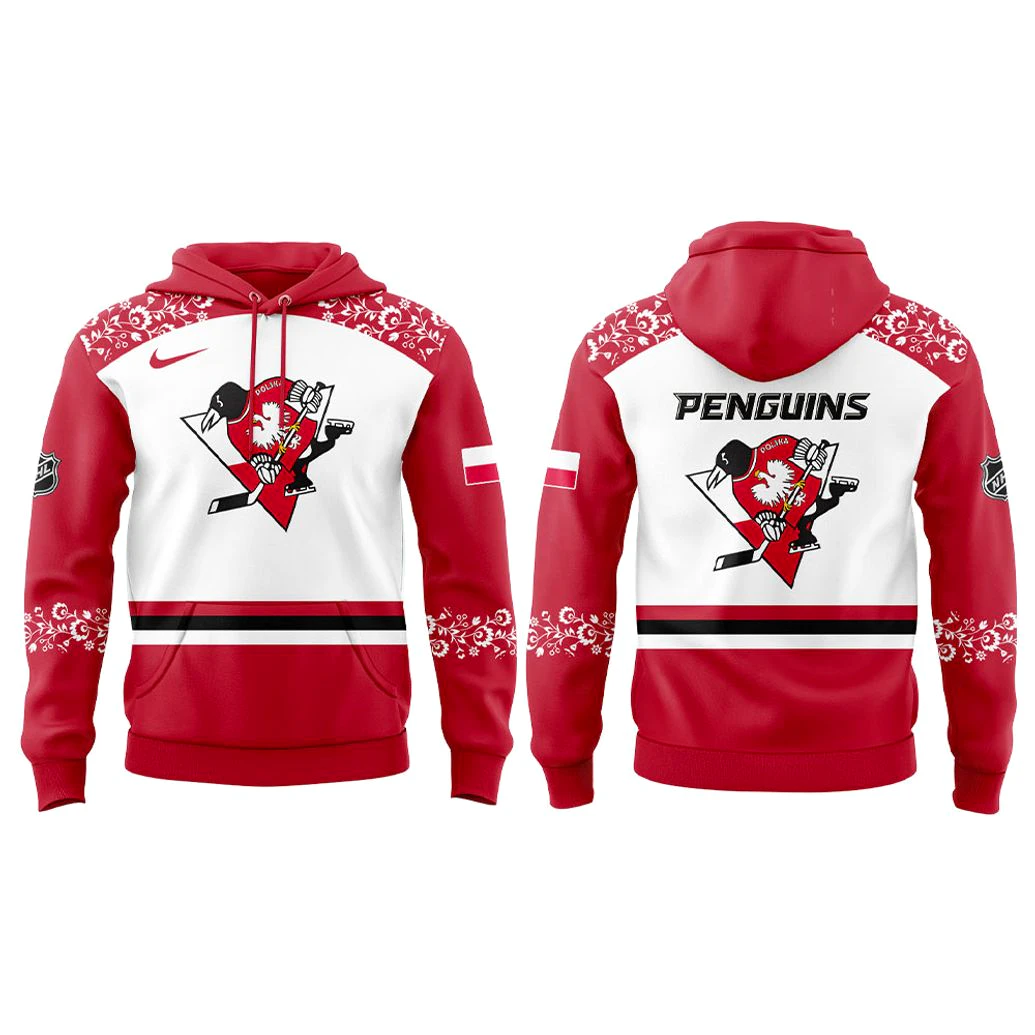 True to PintSizedPremium’s commitment to unparalleled craftsmanship, this Pittsburgh Penguins Polish Heritage Night 2025 Hoodie is a masterclass in design and quality. The striking visual narrative begins with a bold color palette, featuring the iconic deep red and crisp white that instantly evoke both team colors and national pride. The body of the hoodie is rendered in a rich red, providing a strong foundation, while the shoulders and upper hood are adorned with an intricate white pattern, reminiscent of traditional Polish folk artistry, featuring stylized floral motifs that speak to centuries of cultural expression. At the heart of the design, prominently displayed on both the front and back, is a captivating emblem: the fierce spirit of the Pittsburgh Penguins stylized within a triangular shield, boldly reimagined with the proud white eagle of Poland. This powerful fusion sees the majestic eagle taking the place of the penguin’s body, firmly gripping a hockey stick, creating a truly unique symbol of combined identity. Further enhancing its cultural resonance, a subtle yet significant Polish flag emblem is expertly integrated onto the left sleeve, while the reverse proudly displays the word “PENGUINS” in a dynamic, contrasting black typeface above the central emblem. Horizontal stripes in black, white, and red elegantly frame the lower torso, adding a sophisticated finish that ties the entire design together. Every stitch and print detail reflects a dedication to excellence, ensuring this garment is not only visually stunning but also built to last, providing comfort and style for years to come.