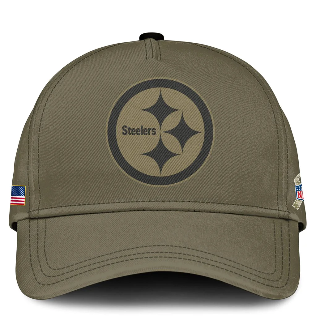 Design elements: Military-inspired olive drab base, iconic Steelers shield logo, American flag patch, “Salute To Service” tribute branding, authentic team details.