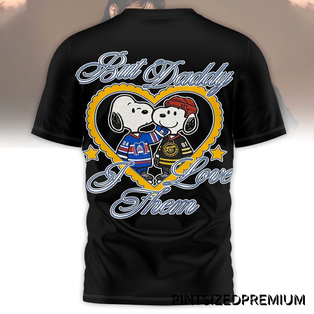 The Raiders Boston Hockey But Daddy Love Them Shirt exemplifies PintSizedPremium’s unwavering commitment to exceptional craftsmanship and innovative design. The front of this striking black garment proudly displays the “RAIDERS BOSTON HOCKEY EST. NINETEEN TWENTY-FOUR” motif. “RAIDERS” arcs gracefully in vibrant, classic gold above a stylized ‘R’ crest, contrasting sharply with the deep black fabric. “BOS MA” and “BOSTON HOCKEY” are prominently featured below, anchoring the design with authentic tradition. “EST. NINETEEN TWENTY-FOUR” adds a subtle layer of storied history, invoking a timeless connection to the game’s roots. This front design uses high-definition, durable print ensuring crisp lines and fade-resistant color, maintaining integrity wash after wash. The back reveals its heartwarming crossover narrative: two endearing cartoon canine characters within a bold, golden heart outline, radiating warmth. One character wears a distinctive blue and orange hockey uniform with a jersey number, while its companion sports a classic black and yellow ensemble, also numbered and featuring a charming red helmet, symbolizing diverse yet fervent allegiances. Above the heart, the elegant script “But Daddy” flows beautifully, mirrored by “I Love Them” below, all in graceful blue with a crisp white outline, surrounded by scattered golden stars. This intricate back design, realized through sophisticated printing, guarantees vibrant colors and a soft hand-feel, ensuring both visual appeal and supreme comfort, embodying PintSizedPremium’s dedication to premium crossover fan merchandise that truly tells a story.