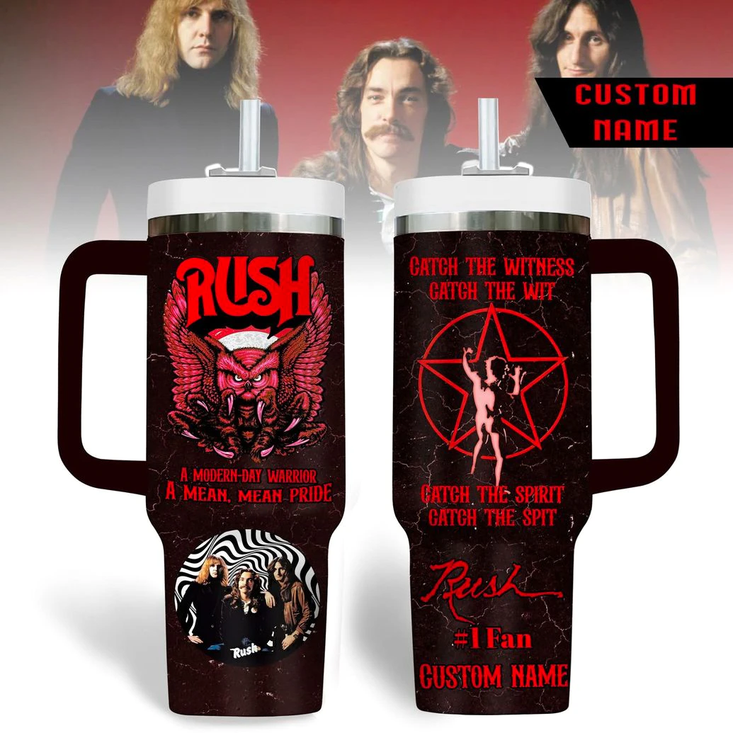 Crafted with meticulous attention to detail and designed to resonate deeply with the devoted, this premium tumbler embodies the raw energy and intricate artistry that defines a legendary rock band. The visual narrative begins with a rich, dark background, subtly textured with what appears to be a fractured or cracked pattern, reminiscent of ancient, enduring stone, providing a dramatic canvas for the vibrant graphics. Dominating one side is the bold, iconic RUSH logo rendered in striking red, beneath which a formidable, red-winged owl with piercing crimson eyes perches, almost glowing with an arcane intensity, a powerful symbol of wisdom and watchful strength. Below this fierce guardian, the resonant phrase “A MODERN-DAY WARRIOR A MEAN, MEAN PRIDE” is emblazoned, echoing the band’s anthemic declarations. Towards the base, a circular motif encloses a classic image of the band members, rendered in a mesmerizing black and white wavy, almost psychedelic pattern, showcasing their timeless appeal. The reverse side of the tumbler features the equally recognizable “Starman” figure, arms raised in triumph within a stark red pentagram, a profound symbol of enlightenment and individualism. Accompanying this is the evocative lyric “CATCH THE WITNESS CATCH THE WIT” and “CATCH THE SPIRIT CATCH THE SPIT,” connecting directly to the band’s lyrical genius. A cursive “Rush” signature logo is elegantly placed, followed by “#1 Fan” and an intriguing “CUSTOM NAME” section, suggesting a personalized touch that makes this tumbler uniquely yours. Constructed from durable, high-grade stainless steel with superior insulation, it boasts an ergonomic handle and a secure, spill-resistant lid, ensuring both functionality and longevity. Every graphic element is applied with an advanced printing technique, ensuring vibrant colors and crisp details that resist fading, a testament to PintSizedPremium’s unwavering commitment to exceptional craftsmanship and enduring quality, creating a piece that is as robust as the music it celebrates.