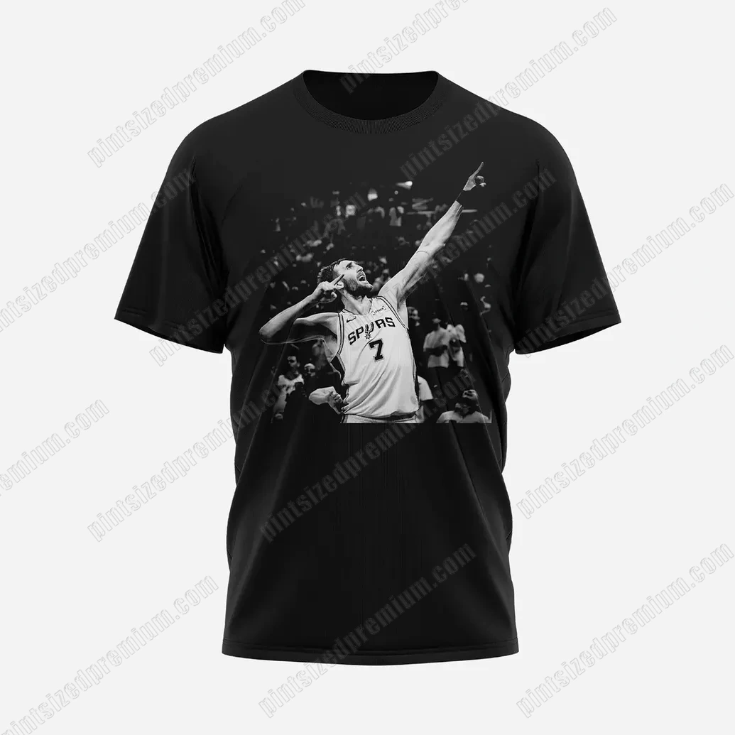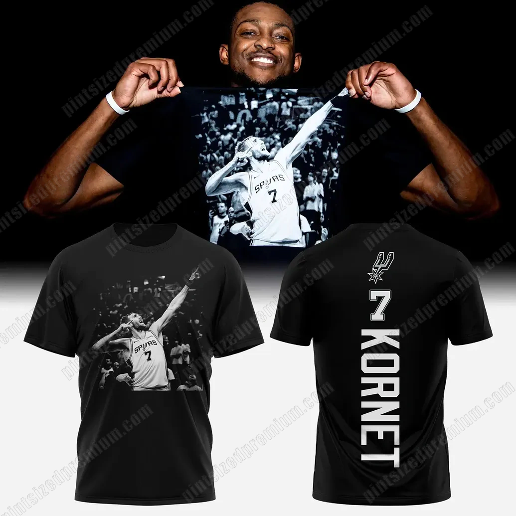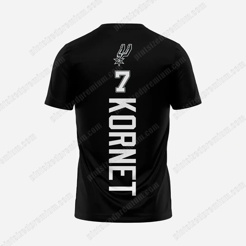 Every PintSizedPremium garment is a testament to our unwavering commitment to craftsmanship, and the San Antonio Spurs Luke Kornet T-Shirt is no exception. We begin with a foundation of superior quality, utilizing a luxurious, soft-touch fabric in a timeless black hue that ensures both comfort and durability. This isn’t just a basic tee; it’s a meticulously constructed canvas for a narrative of athletic excellence. The front of this exclusive shirt features a stunning, high-definition black and white photographic print, capturing Luke Kornet in an iconic, triumphant pose—arms outstretched, pointing skyward, number 7 prominently displayed on his Spurs jersey amidst a cheering crowd. This impactful monochromatic rendering is chosen to emphasize the drama and raw emotion of the moment, transcending mere color to deliver a powerful visual statement. The print technique employed guarantees exceptional detail and longevity, ensuring the image remains crisp and vibrant wash after wash, resisting fading or cracking that often plagues lesser quality fan apparel. Turning the shirt reveals PintSizedPremium’s thoughtful design, featuring the distinctive San Antonio Spurs spur-and-star logo subtly positioned at the top of the back, a hallmark of authenticity and team pride. Below it, Kornet’s name, “KORNET,” is boldly printed vertically in crisp white, accompanied by his jersey number “7,” creating a striking and modern aesthetic. This precise application of design elements underscores our dedication to creating premium crossover fan merchandise that not only looks exceptional but stands the test of time, reflecting the quality and spirit of the legendary Spurs franchise.