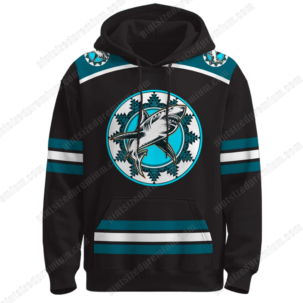 Crafted with meticulous attention to detail, this premium hoodie from PintSizedPremium is a masterclass in design, directly translating the artistic vision of Sarah Tang into a wearable masterpiece. The base of the hoodie is a rich, deep black, providing a striking canvas for the vibrant teal and pristine white accents that define its aesthetic. Across the chest, a prominent circular emblem captures the eye, featuring a powerful San Jose Sharks logo rendered with dynamic energy, encased within an intricate border of Native American-inspired geometric patterns in harmonious shades of teal, white, and black. This central motif is a focal point, symbolizing the deep cultural roots and the fierce spirit of the team. The sleeves and lower body are elegantly adorned with bold stripes of teal and white, reminiscent of classic athletic apparel yet infused with a modern, heritage-inspired twist. Turning to the back, the commitment to unique design continues. Spanning the shoulders, the words “SAN JOSE” are subtly presented above a large, impactful “SHARKS” rendered in a distinctive, jagged font that evokes the powerful, undulating motion of ocean waves. Below this, the iconic circular shark emblem with its intricate patterns is repeated, further reinforcing the design’s cultural significance. Completing the back design, the declaration “NATIVE AMERICAN HERITAGE” is proudly displayed, affirming the core inspiration of this limited edition piece. Every stitch, every color choice, and every graphic placement has been thoughtfully executed to ensure this San Jose Sharks Sarah Tang American Heritage 2025 Limited Edition Hoodie is a beacon of quality and an authentic representation of its unique collaboration.