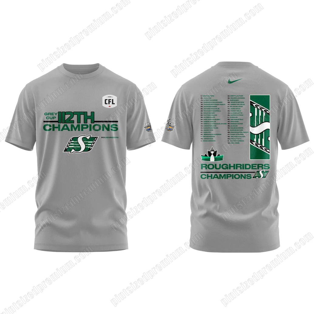 PintSizedPremium is dedicated to crafting crossover fan merchandise that transcends typical fan wear, blending high-quality craftsmanship with iconic design. This limited-edition t-shirt is rendered in a sophisticated, versatile grey hue, providing a clean canvas for the vibrant Roughriders iconography. The front proudly declares “GREY CUP 12TH CHAMPIONS” in a bold, dynamic graphic, featuring striking green lettering accented with crisp white details, instantly signaling the monumental achievement of their twelfth championship. Below this, the legendary Saskatchewan Roughriders “S” logo, impeccably detailed and rendered in its signature green and white, commands attention, its powerful lines signifying strength and tradition. A subtle #ROUGHRIDERS hashtag serves as a modern nod to the team’s expansive digital community. On the right sleeve, a crisp, officially recognized league emblem assures authenticity and premium fan status. Turning to the reverse, the shirt unfolds a powerful tribute: a comprehensive roster of player names and numbers, each integral to the projected 2025 victory, presented in a clean, legible green font against a stylized, flowing green and white pattern, reminiscent of a championship banner. The phrase “ROUGHRIDERS CHAMPIONS” is prominently displayed, further emphasizing the team’s greatness, complemented by another bold “S” logo. A proud emblem featuring a Canadian maple leaf and a trophy icon crowns the design, symbolizing national pride and sporting excellence. Every element, from the vibrant color saturation to the precision of the print, speaks to a meticulous attention to detail, ensuring the design remains sharp and resilient through countless wears and washes. The fabric itself is chosen for its superior comfort and lasting quality, offering a soft touch and breathable wear that stands up to the excitement of game day or the relaxed vibe of everyday life.