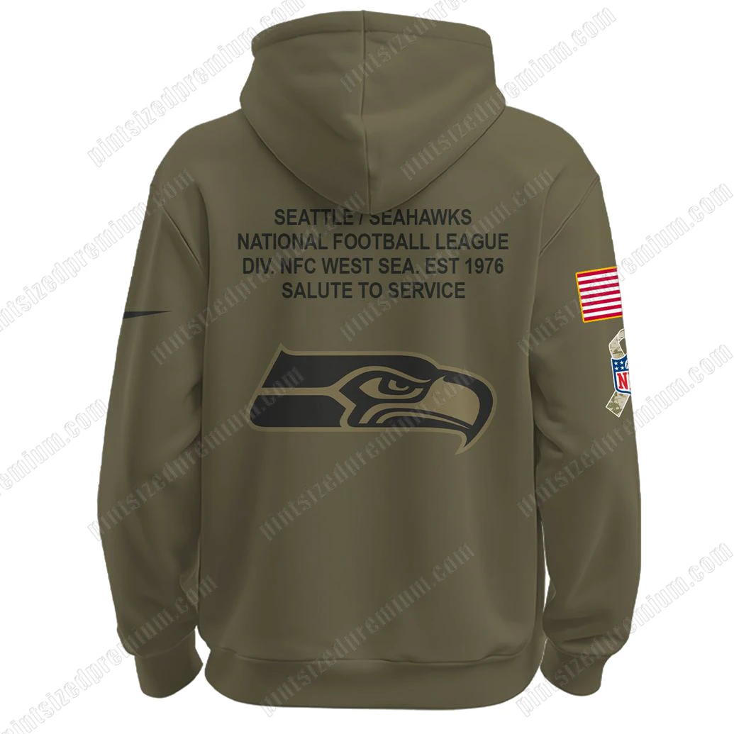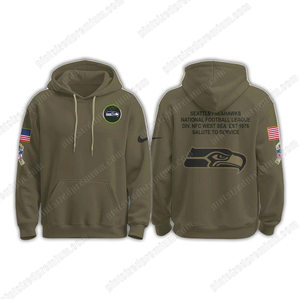 At PintSizedPremium, craftsmanship is not just a promise; it’s the very foundation of our brand, and the SEA Seattle Seahawks 2025 Salute To Service Hoodie exemplifies our unwavering commitment to quality. This isn’t mass-produced apparel; it’s a carefully designed piece, beginning with its commanding olive green hue, a deliberate choice that not only exudes a sophisticated, earthy aesthetic but also subtly echoes the military-inspired theme of service and dedication. The fabric itself is chosen for its luxurious feel and enduring comfort, a premium blend that ensures both warmth for those crisp game days and breathable comfort for casual wear, standing up to the demands of an active lifestyle while maintaining its pristine condition. Observe the meticulous details: the iconic Seattle Seahawks circular emblem, vibrantly highlighted by a striking green outline, is not merely printed but expertly integrated on the chest, showcasing the bold hawk head with precision and clarity. On the sleeves, you’ll find intricately stitched patches – a proud representation of the American flag and a distinctive tribute ribbon motif, reflecting the spirit of honoring service. These aren’t simple appliqués; they are crafted with a level of detail that speaks volumes about their significance. A sleek, understated dark emblem adorns the sleeve cuff, adding a touch of contemporary athletic flair without distracting from the overall design’s reverence. Turning to the back, the striking text proclaims “SEATTLE SEAHAWKS NATIONAL FOOTBALL LEAGUE DIV. NFC WEST SEA. EST 1976 SALUTE TO SERVICE” in sharp, durable lettering, positioned above a powerfully rendered, oversized Seahawks hawk head logo. This combination is applied with advanced printing techniques, ensuring it remains crisp, vibrant, and resistant to fading, wash after wash. The practical elements are equally considered: robust, natural-toned drawstrings for the hood and a generously sized kangaroo pocket offer both functionality and a relaxed, casual aesthetic. Every seam, every stitch, every design element is a testament to PintSizedPremium’s dedication to producing premium crossover fan merchandise that not only looks exceptional but is built to last, offering an unparalleled tactile and visual experience.
