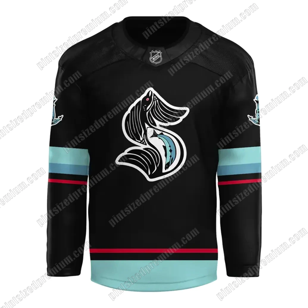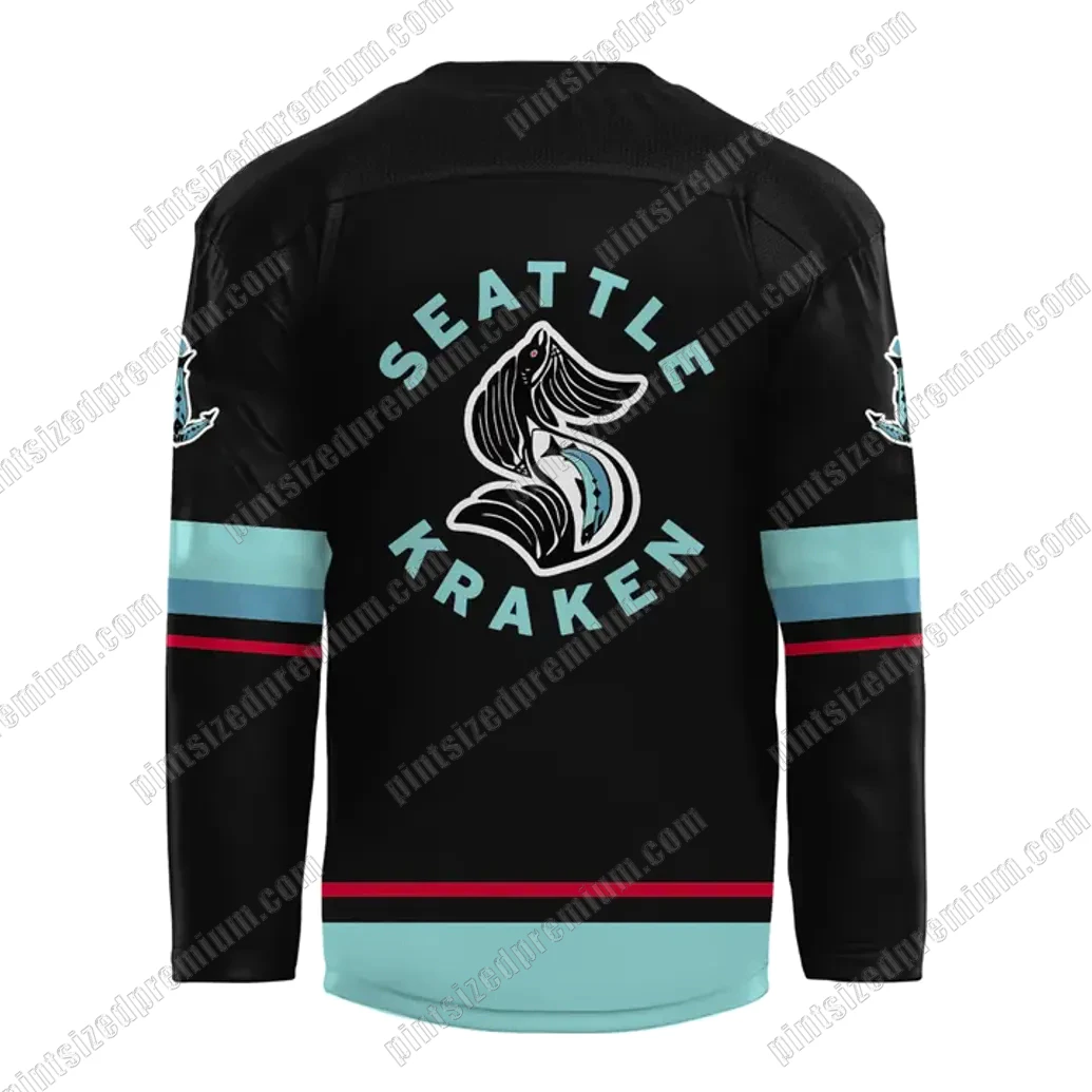 Every stitch and hue of the Seattle Kraken Indigenous Peoples New Edition Hockey Jersey reflects PintSizedPremium’s unwavering commitment to superior craftsmanship and thoughtful design. The jersey’s foundational black serves as a bold canvas, allowing the striking teal, white, and subtle red accents to truly pop. The front proudly features the iconic Seattle Kraken ‘S’ logo, reimagined with intricate Indigenous art-inspired details. This central emblem, a powerful blend of marine legend and traditional aesthetics, is meticulously applied, showcasing the detailed artistry of the kraken’s eye and tentacle elements within the letterform, highlighted by crisp white outlines against the rich black background. Moving to the sleeves, broad bands of vibrant teal, separated by the jersey’s base black, are punctuated by a subtle red stripe, adding dynamic contrast and a touch of the team’s signature color scheme, extending down to the matching teal hem. On the back, the phrase “SEATTLE KRAKEN” arcs gracefully above the redesigned kraken logo, rendered in the same distinctive teal, ensuring visibility and team allegiance from every angle. The shoulders feature smaller, stylized kraken anchor logos in teal, providing an additional layer of authentic detailing. Crafted from advanced, breathable performance fabric, with a distinctive mesh paneling across the shoulders, this jersey is engineered for comfort and durability, whether you are on the ice, in the stands, or part of a bustling urban environment. The textures and finishes speak volumes about the quality, ensuring this piece is not only visually stunning but also built to last, a testament to PintSizedPremium’s dedication to excellence in every garment.