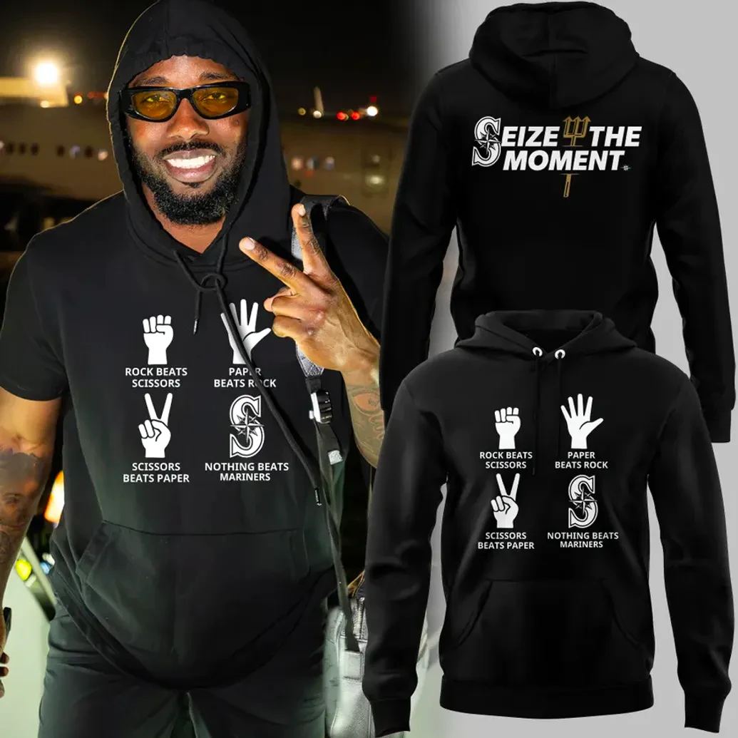 At PintSizedPremium, we believe true fan merchandise combines passion with unparalleled quality. The Seattle Mariners Paper Beats Rock Hoodie is a testament to this philosophy, meticulously crafted for the discerning fan. Starting with the foundation, this hoodie is constructed from a superior, heavyweight cotton blend, offering exceptional warmth, softness, and durability. The rich, deep black fabric provides the perfect canvas for the striking graphics that define this unique piece. On the front, the ingenious “Rock Beats Scissors,” “Paper Beats Rock,” “Scissors Beats Paper,” and “Nothing Beats Mariners” graphic is rendered in crisp, high-definition white print. Each iconic hand gesture is flawlessly executed, leading down to the unmistakably bold, star-accented Seattle Mariners ‘S’ logo—a symbol of enduring legacy and contemporary flair. This isn’t just a print; it’s an artful visual narrative, designed to resist fading and cracking, ensuring your statement remains vibrant for years to come. The reverse side of the hoodie carries an equally powerful message: “SEIZE THE MOMENT.” This inspirational motto is beautifully integrated with the classic Mariners ‘S’ logo forming the initial letter, and a distinctive trident graphic replacing the ‘I,’ all highlighted with subtle gold accents that catch the light and add a touch of premium sophistication. Every stitch, every seam, and every detail, from robust drawstrings to the spacious kangaroo pocket, speaks to PintSizedPremium’s unwavering commitment to craftsmanship. This is not fast fashion; this is a lasting tribute, designed to withstand the rigors of enthusiastic fandom and everyday adventure, ensuring comfort without compromising on style or durability.