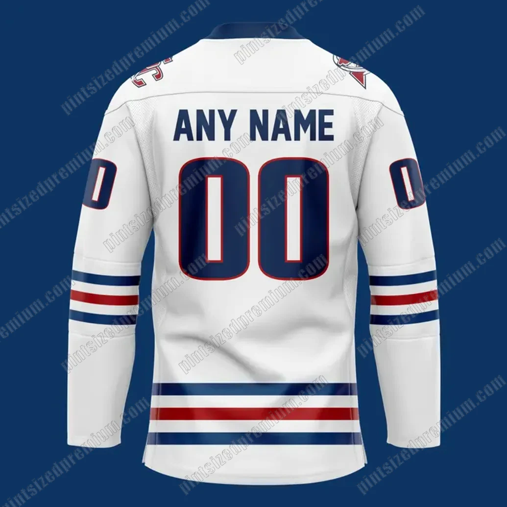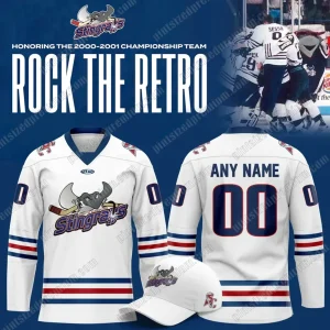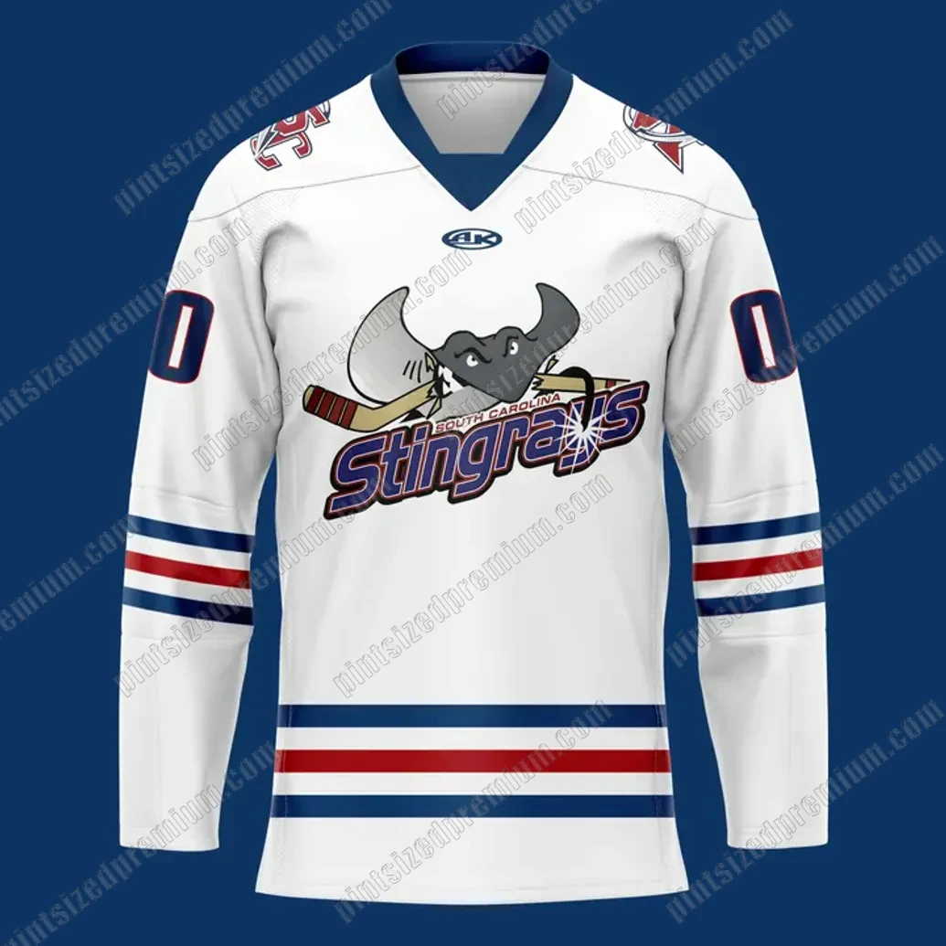 PintSizedPremium’s commitment to unparalleled craftsmanship is evident in every stitch and fiber of this commemorative garment. The South Carolina Stingrays 2025 Rock the Retro Jersey showcases a brilliant, crisp white base, providing a clean canvas that truly makes the iconic team elements pop. The deep navy blue V-neck collar offers a sophisticated contrast, framing the design with a nod to classic hockey aesthetics. Front and center, the instantly recognizable Stingray logo commands attention: a powerful grey stingray gracefully gliding with a hockey stick, anchored by the bold “South Carolina Stingrays” script, rendered with meticulous detail to capture its original charm. On each shoulder, a prominent navy blue “0” stands out, harking back to a bygone era of athletic wear, adding to the authentic retro feel. The sleeves feature distinct, horizontally banded stripes in red, white, and blue, carefully placed near the cuffs to evoke the timeless appeal of vintage hockey apparel while subtly celebrating a patriotic spirit. Turning to the back, the jersey offers a personalized touch with “ANY NAME” elegantly presented in navy blue lettering above the striking “00,” customizable to reflect your unique connection to the team or honor a favorite player. Each element, from the sharpness of the logos to the carefully chosen color palette, is engineered for authenticity and longevity, ensuring that this jersey is not merely merchandise but a premium piece of wearable art, designed to stand the test of time and countless celebratory moments.